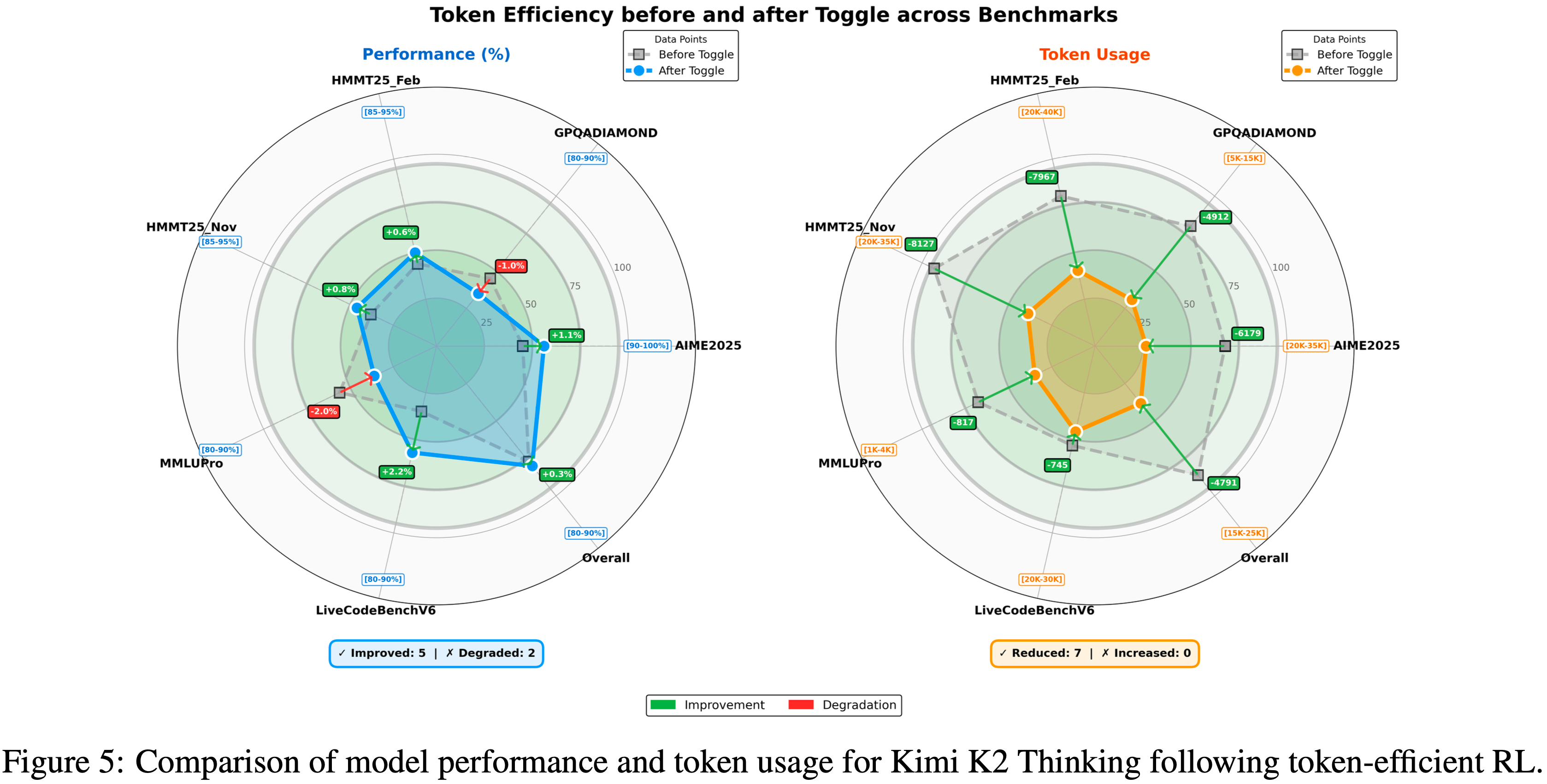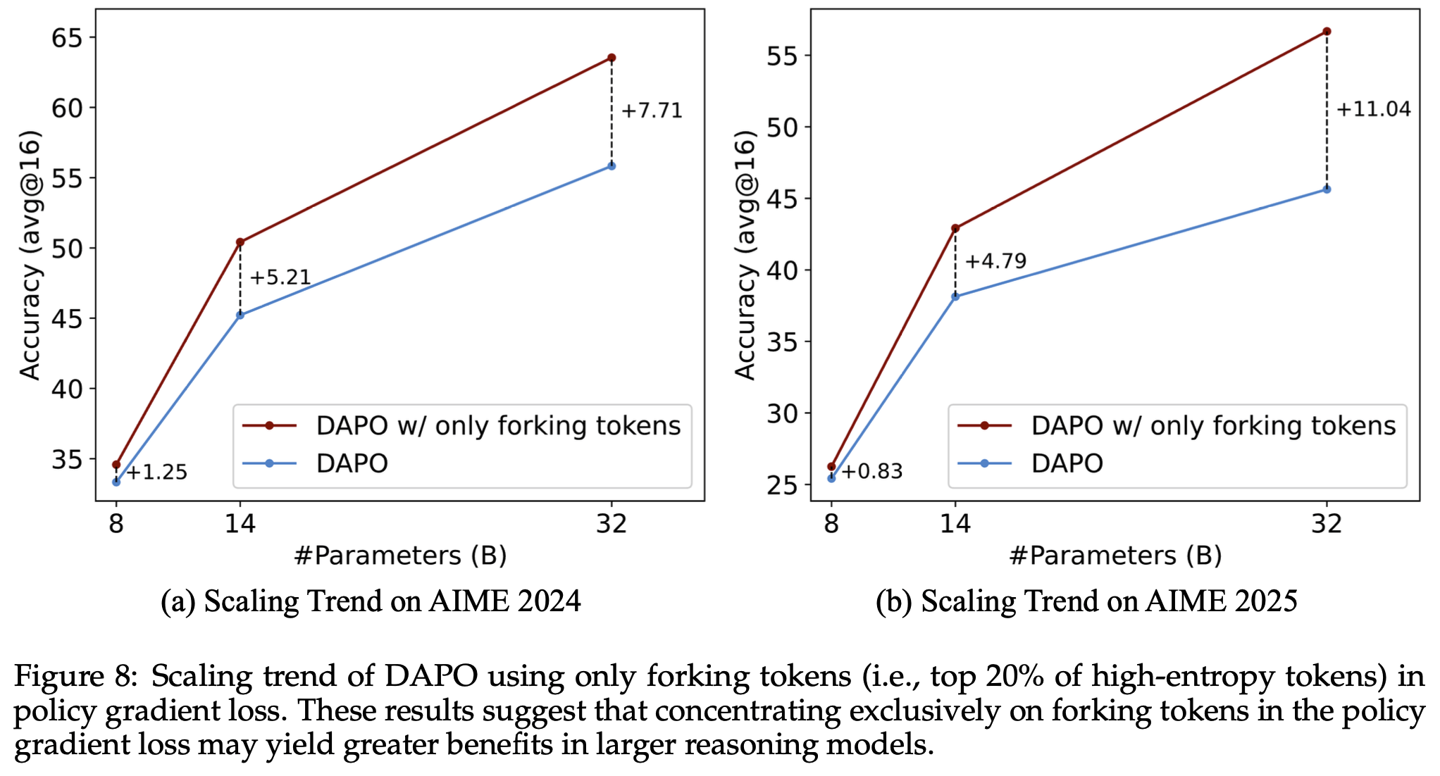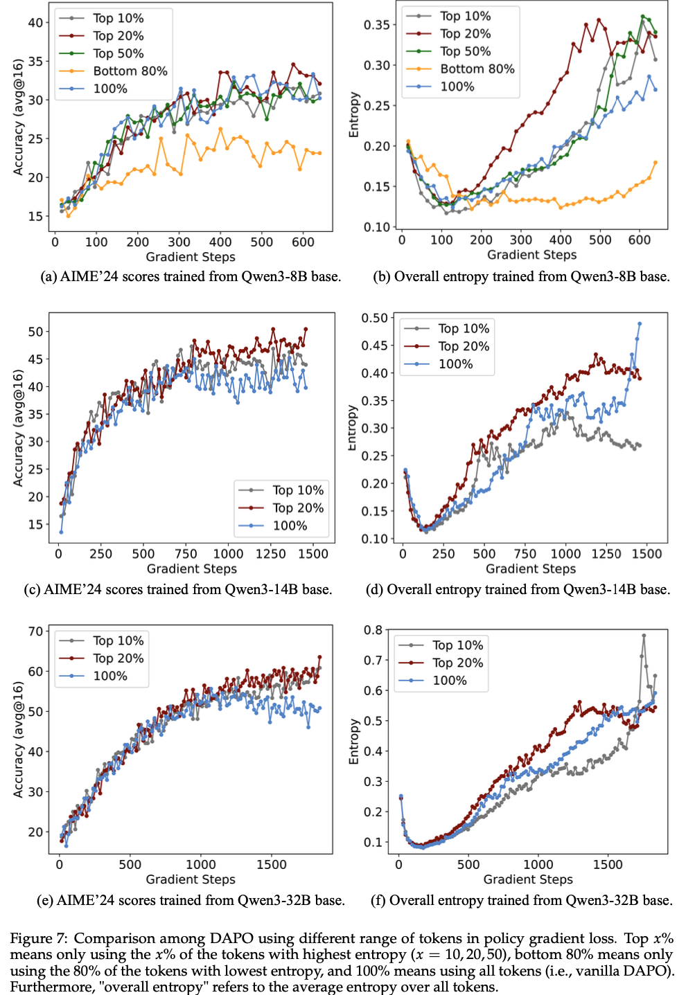 RLVR 主要调整高熵 Token 的熵值,而低熵 Token 的熵值相对稳定,变化较小(RLVR predominantly alters the entropy of high-entropy tokens, whereas the entropy of low-entropy tokens remains comparatively stable with minimal variations.)