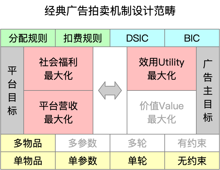 • 注意:一般的广告拍卖场景中(包括万字长文,漫谈广告技术中的拍卖机制设计(经典篇)),一般都将广告的经典机制设计范畴规约在“异质多物品、单参数、单轮和无约束”拍卖形式下(简称多物品拍卖