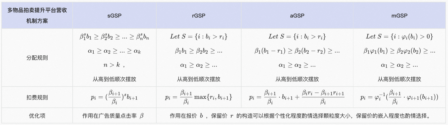 • 在多物品拍卖场景,广告多坑位拍卖一般围绕改造 GSP 机制来近似实现最优结果,具体来说,是将Myerson机制和GSP机制结合起来
