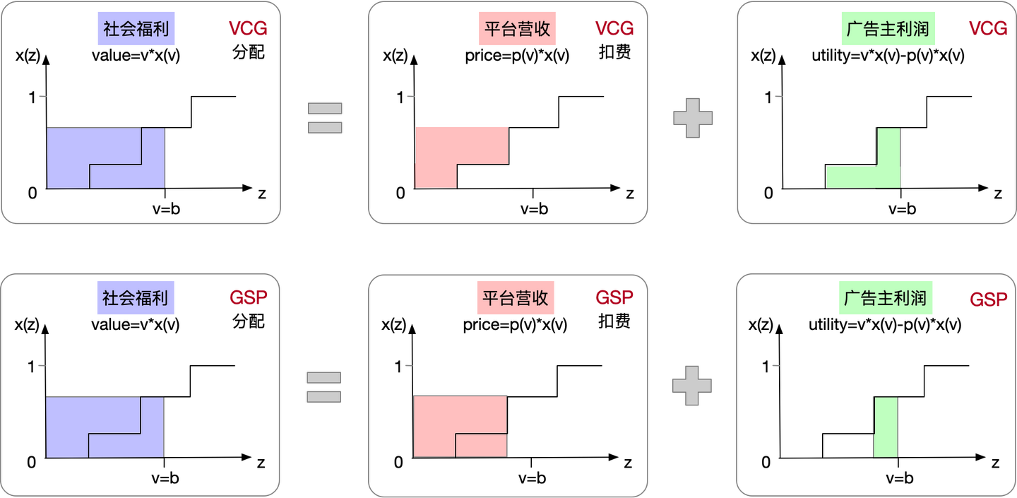 • \(z\) 表示估值分布,\(v\) 表示真实估值,\(b\) 表示报价;\(x(z)\) 表示分配结果(对应为点击率),\(p(v)\) 或 \(p(b)\) 表示计费结果