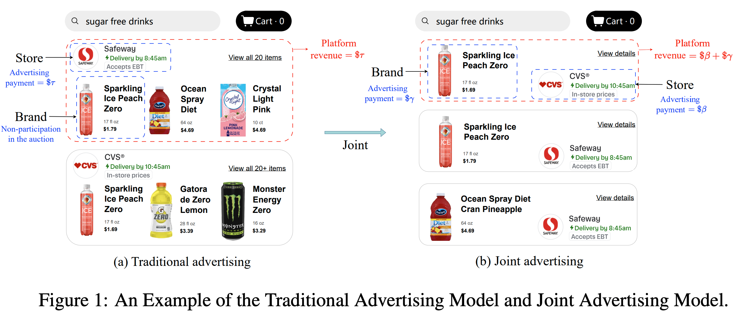 • 模式建模 :为了解决这一问题,论文创新性地提出了一种名为 “联合拍卖” 的联合广告模式,允许品牌商供应商和零售商共同竞拍广告位,以满足双方的需求