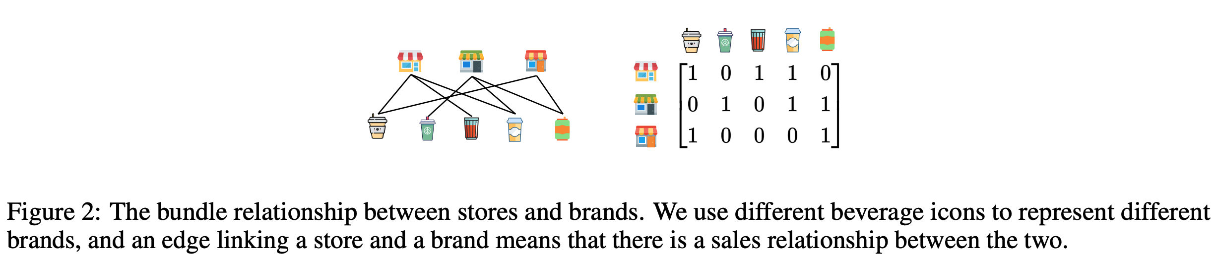 • 有 \( m \) 家零售商和 \( n \) 个品牌商参与联合拍卖。对于零售商 \( i \in M = \{1, \ldots, m\} \) 和品牌商 \( j \in N = \{1, \ldots, n\} \),论文定义一个指示变量 \( \mathbf{1}_{ij} \) 来表示零售商 \( i \) 和品牌商 \( j \) 是否可以组成一个捆绑。具体来说,\( \mathbf{1}_{ij} = 1 \) 表示零售商 \( i \) 和品牌商 \( j \) 存在合作关系。此外,论文用一个矩阵来表示所有零售商和品牌商之间的捆绑关系,其中每个实体是一个定义在零售商和品牌商对上的指示变量(如图 2 示例)。在同一联合拍卖场景中,不同搜索查询样本的矩阵中的联合拍卖关系可能不同