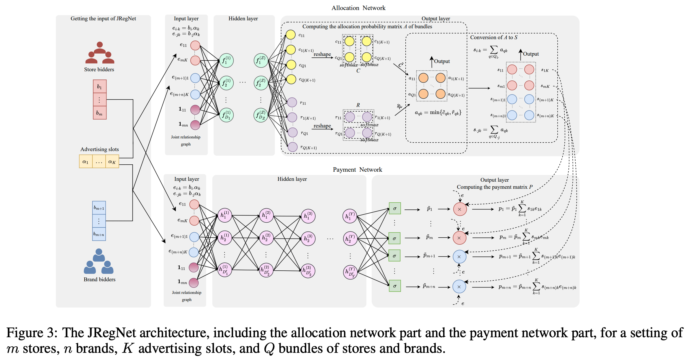 • 独立遗憾网络(JRegNet) :一种广告拍卖场景下的最优机制设计神经网络架构,其中 零售商与品牌商作为独立候选者竞争不同广告位(即每个广告位仅展示 零售商或品牌商广告,此场景实际中不存在)