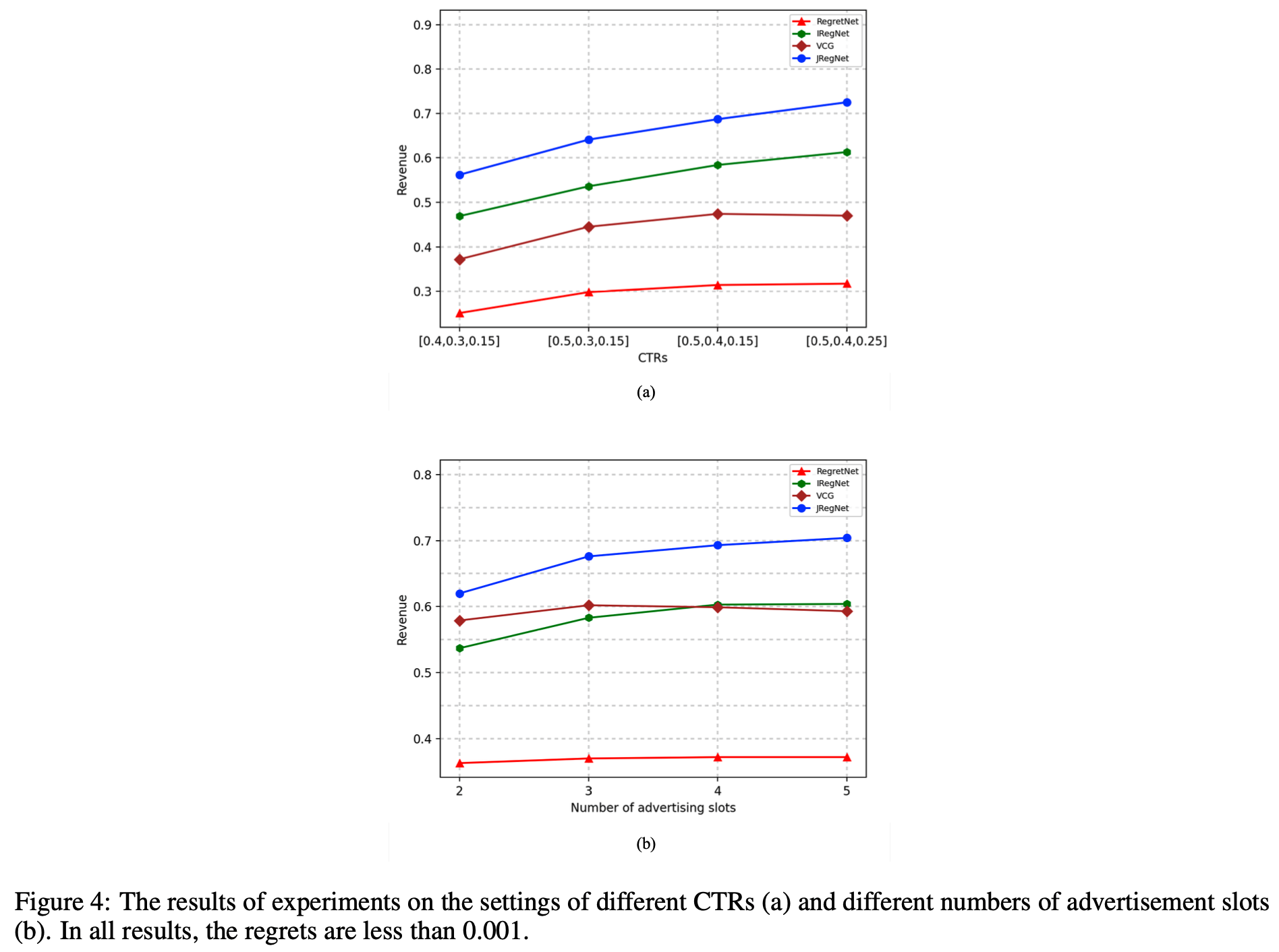 • 图4(b)显示,JRegNet生成的机制在所有设置中表现最佳,且其收入随广告位数量严格递增,而其他机制未呈现此规律