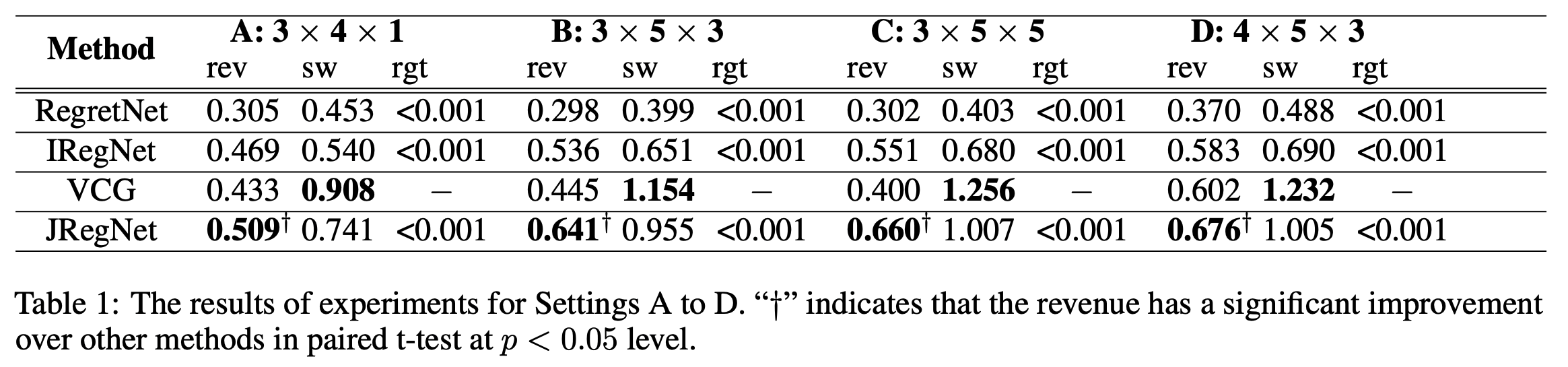 • 表1展示了设置A至D的实验结果。首先,在所有自动化机制设计方法中,当遗憾值小于0.001时,JRegNet生成的机制收入显著高于RegretNet与JRegNet,表明联合广告模型能较传统模型获得更高收入。此外,在联合广告场景中,JRegNet的收入亦显著优于VCG,尽管存在一定社会福利损失。这说明JRegNet生成的机制在收入方面表现优异,且JRegNet架构有效