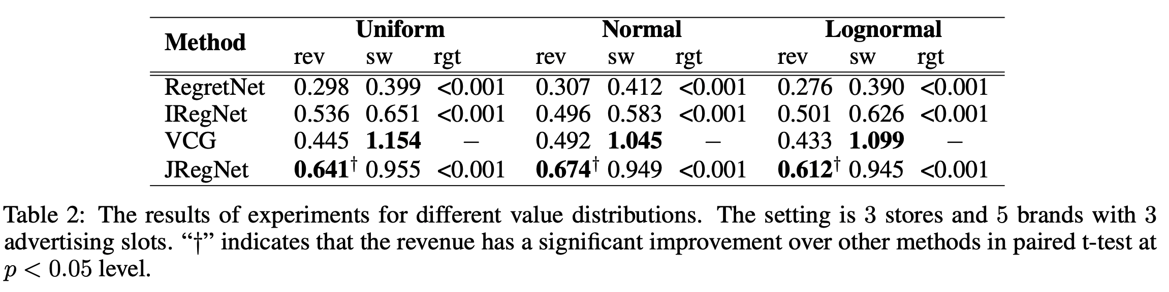 • 在设置B下,对三种价值分布重复实验:均匀分布 \( U[0,1] \)、正态分布 \( N(0.5, 0.0256) \)(\( v \in [0,1] \))、对数正态分布 \( LN(0.1, 1.44) \)(\( v \in [0,1] \))。表2结果显示,JRegNet在三种分布下均实现最高收入,表明其机制对不同价值分布具有稳定性与鲁棒性