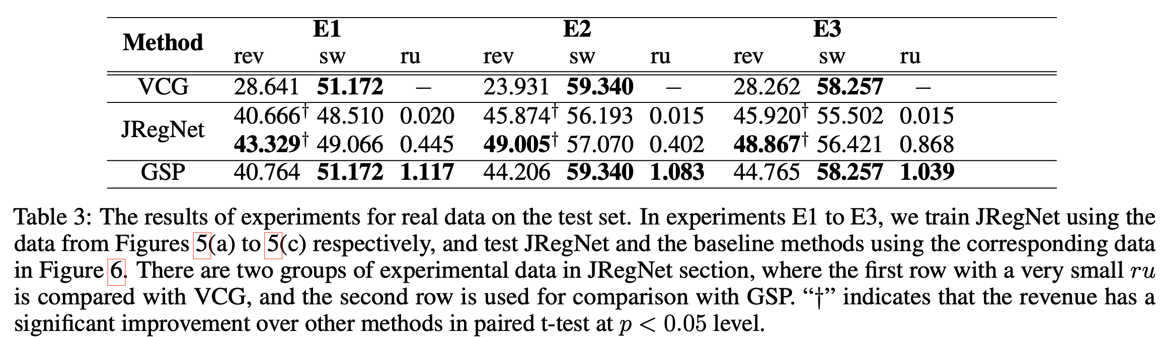 • 使用三个不同时间段的真实数据训练JRegNet,并分别用三个时间点的数据测试。附录A.2的图5与图6展示了训练与测试所用的真实搜索查询样本数量。表3列出了所有真实数据实验中JRegNet、VCG与GSP在测试集上的性能表现(GSP为美团在联合拍卖场景中最初采用的在线机制)
