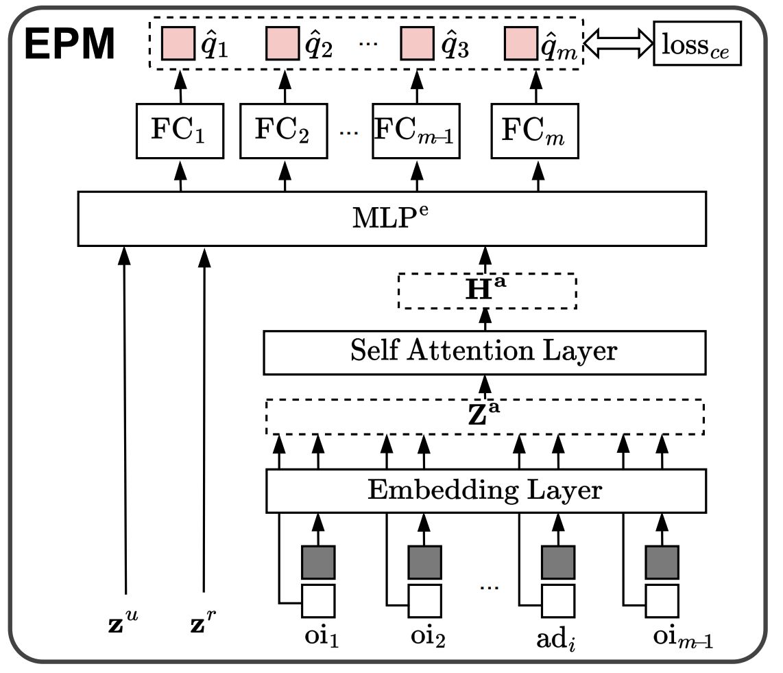 $$\hat{q}_{j}=q_{j}(\mathbf{a})=\text{Sigmoid}\left(\text{FC}_{j} \left(\text{MLP}^{\mathbf{c}}\left(\mathbf{h}^{\mathbf{a}}|\mathbf{z}^{u}|\mathbf{z}^{r}\right)\right)\right),;\forall j\in[m],$$- 其中 \(q_{j}(\mathbf{a})\) 表示分配中第 \(j\) 个项目的pCTR。在EPM中,通过每个项目的真实点击行为计算交叉熵损失来训练该列表模型: