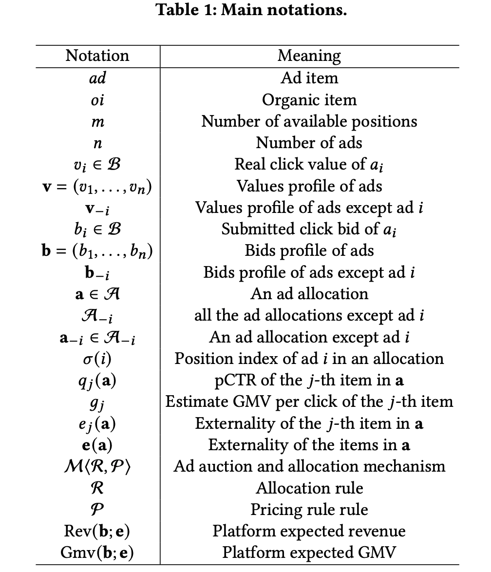 - 论文考虑在信息流中集成按点击付费广告拍卖和分配的机制设计。对于每个用户的页面浏览请求,有 \(m\) 个可用位置用于放置广告和自然商品。有 \(n\) 个广告主竞争一个广告位置,其他 \(m-1\) 个位置由自然商品填充。由于平台业务划分的限制,论文假设这些自然商品已根据估计的GMV进行了排序。在后续过程中,自然商品的相对排名不会被修改,但它们的CTR和GMV将被重新预测。论文的主要符号总结在表1中