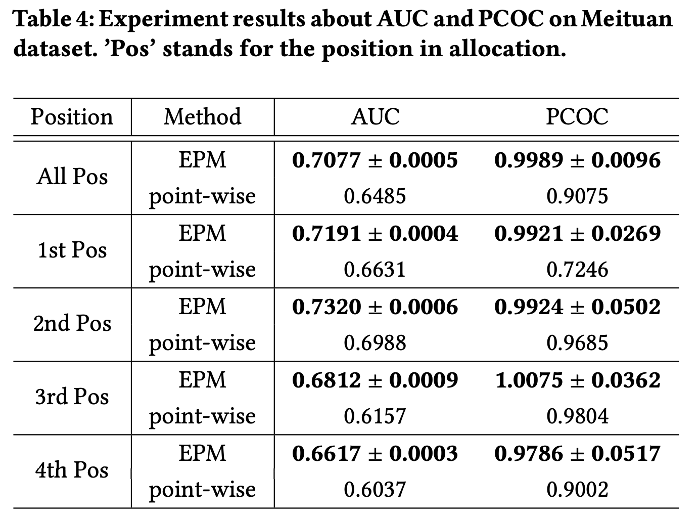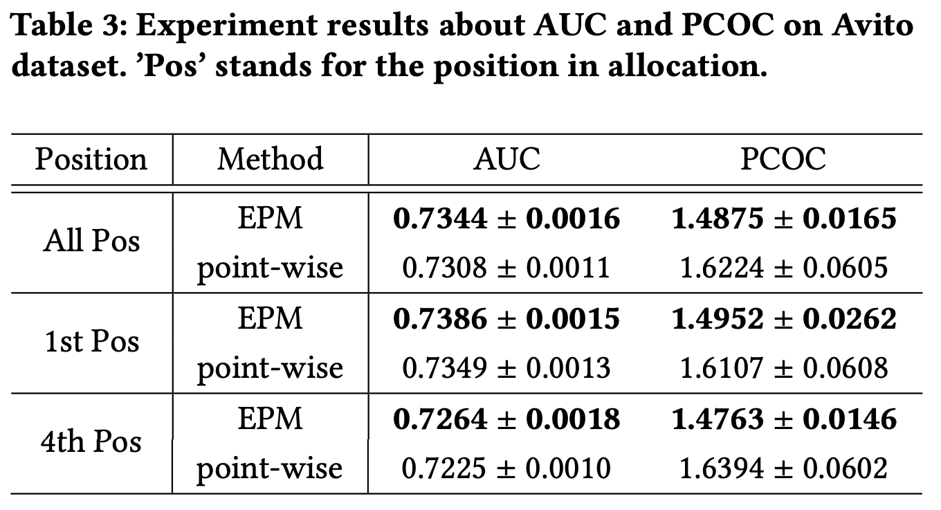 在公共Avito数据集上,论文需要构建EPM的点模型和列表模型。点模型是一个具有多个全连接层 \(256\times 128\times 64\times 32\times 1\) 的深度神经网络。对于每个请求,提取第1、2、6和7位置的项目以形成列表,用于构建EPM的列表模型。如前所述,该列表中只有第1和第4位置有真实的用户点击行为数据,可用于评估这两个模型的性能。Avito数据集上的详细实验结果如表3所示。对于分配中的所有位置,EPM中的列表模型pCTR比点模型pCTR提高了0.0036的AUC,并且其PCOC更接近1。在每个位置,EPM中列表模型的预测结果优于点模型