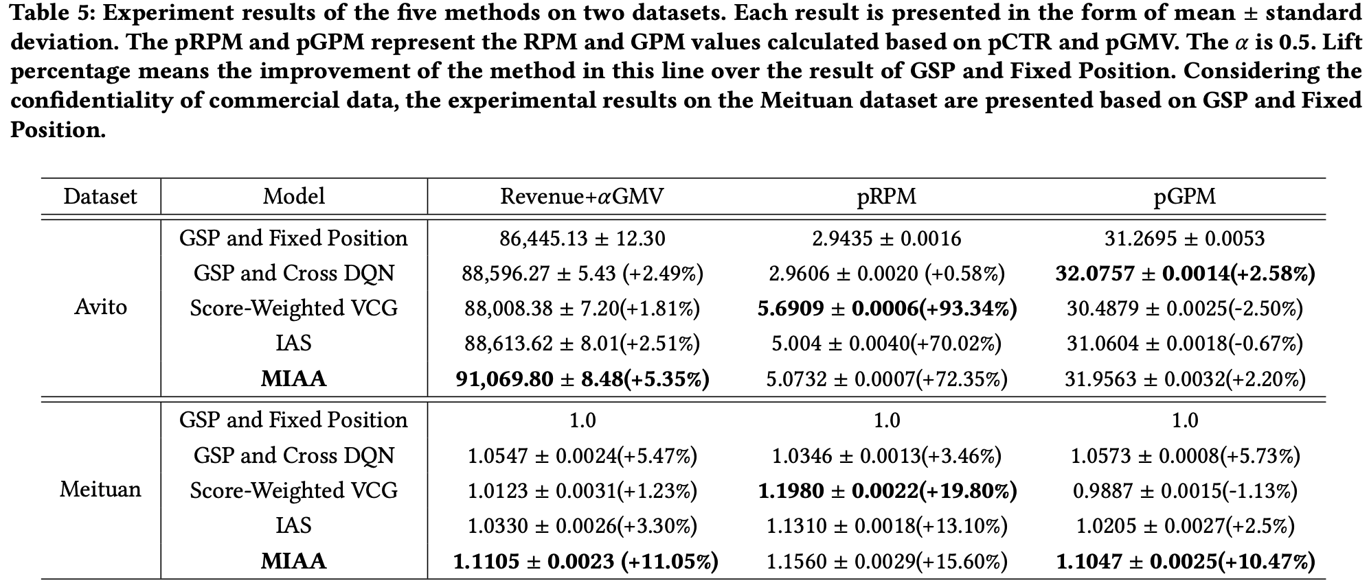 - 为了验证所提出机制在提高平台收入和GMV方面的有效性,论文在两个数据集上实现了GSP和固定位置、GSP和Cross DQN、Score-Weighted VCG和IAS进行比较分析。在公共Avito数据集上,论文选择第1和第7位置的项目作为候选广告,其余三个项目被视为自然商品。此外,论文为每个广告提供模拟出价,并为每个项目提供模拟的每点击pGMV。每个广告的出价独立地从0.5到1.0的均匀分布中采样。同时,自然商品的每点击pGMV独立地从3.5到6.0的均匀分布中采样,广告的每点击pGMV独立地从2.0到4.0的均匀分布中采样。在这两个数据集上,GSP和固定位置基线中的固定位置设置为2。特别指出的是,由于离线模拟系统无法获得不同机制下的实际用户行为数据,这些实验的有效性评估是基于用户对项目的pCTR和pGMV统计得出的。考虑到商业数据的保密性,美团数据集上的实验结果基于GSP和固定位置呈现。公共和工业数据集上的详细实验结果如表5所示