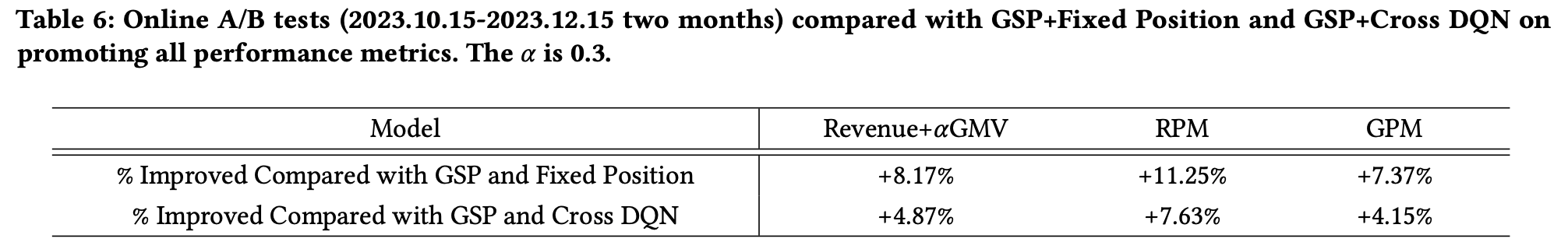 - 为了展示所提出机制的性能,论文在2023年10月15日至2023年12月15日期间使用5%的生产流量进行了在线A/B测试。在实际生产环境中,论文无法基于广告主进行A/B测试。使用基于用户的流量进行A/B测试使得难以评估所提出机制对广告主出价的激励效果。因此,论文只关注实验中的收入、GMV、RPM和GPM的表现。为了在生产流量中公平高效地比较不同基线,论文将实验组中的广告展示次数与基线中的广告展示次数相等。在线A/B测试的实验结果如表6所示。从结果可以看出,与GSP和固定位置以及GSP和Cross DQN相比,所提出的机制在收入、GMV、RPM和GPM方面实现了最高的提升