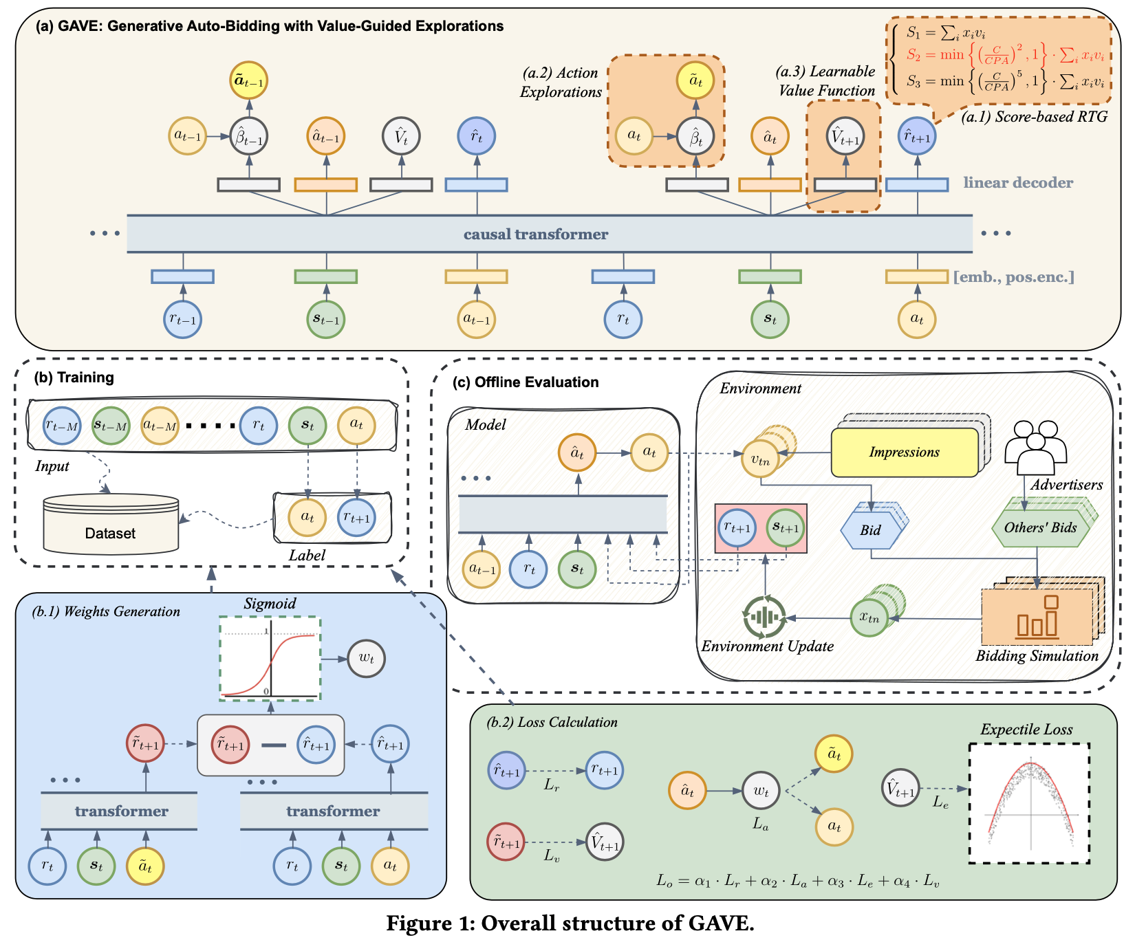 - 引入了创新框架 GAVE ,利用 DT 优化自动出价策略,旨在无缝适应各种现实场景,提出了三项技术创新: