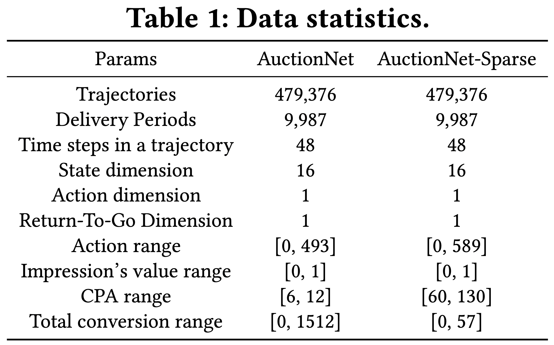 - 以上这两个数据集都包含约 50 万个出价轨迹,收集自 1 万个不同的投放期,每个投放期由 48 个时间步组成,并且包含来自数百万个曝光机会的交互数据。详细统计信息见表1