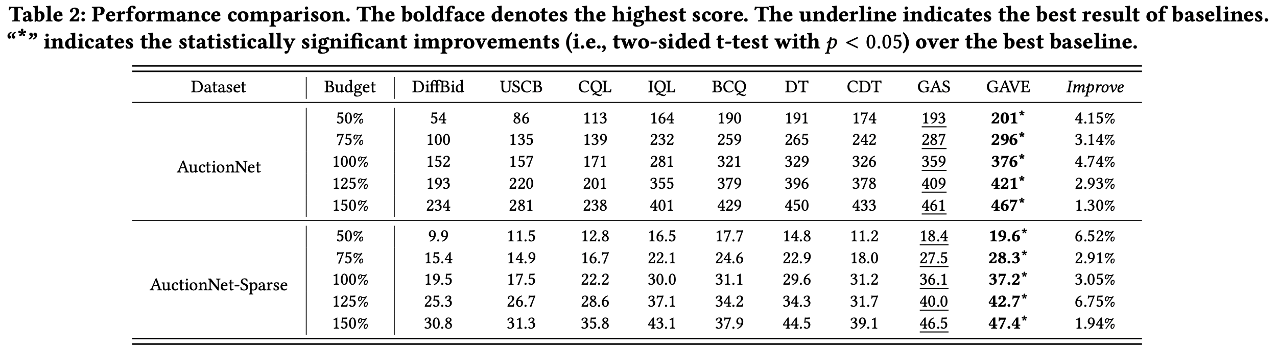- RQ1 :与最先进的自动出价基线方法相比,GAVE 的性能如何?