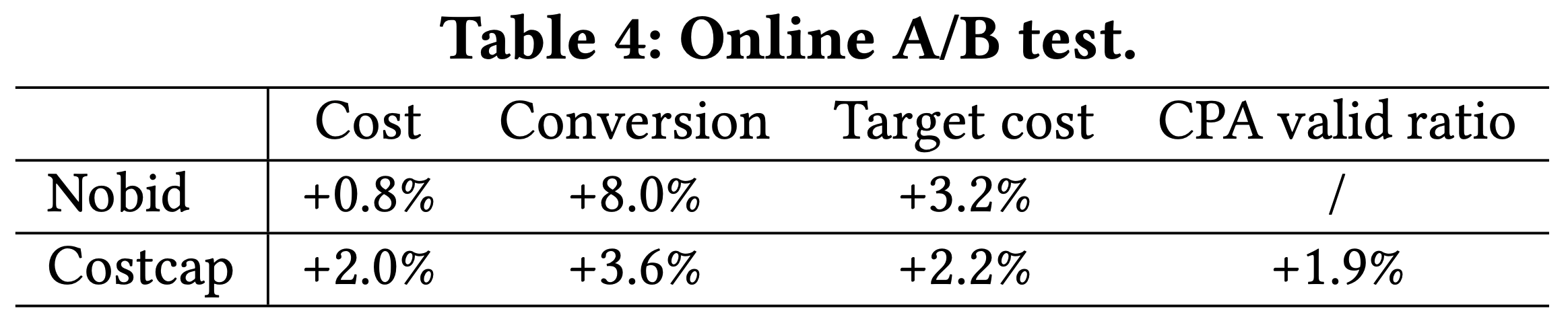 - 如果 Costcap 广告计划的 CPA 保持在限制以下,则认为其 CPA 有效,该指标仅针对 Costcap 广告计划进行评估。论文进行了为期五天的在线A/B测试,将每个广告计划25%的预算和流量分配给基线出价模型和GAVE,结果汇总在表4中