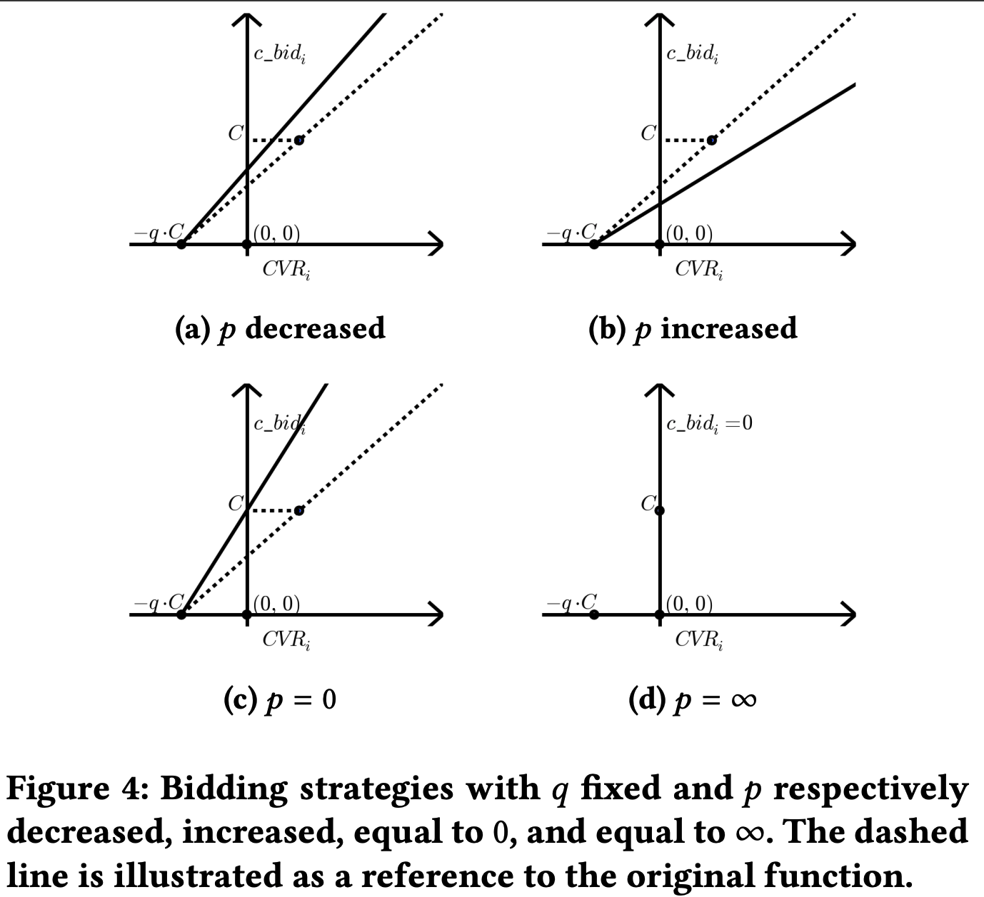 当论文增加 \(p\) 时 ,竞价策略将围绕点 \((-q \cdot C, 0)\) 顺时针旋转。结果是:高于零的竞价价格将降低 ,低于零的竞价价格将提升(注:低于零的价格图上没有画出来,实际上,低于0时不会出价),从而预期成本将减少。以 \(p = \infty\) 和 \(p = 0\) 作为极端例子。当 \(p = \infty\) 时,广告 campaign 的竞价价格始终为零,因此永远不会被收费。当 \(p = 0\) 时,预算不再是一个约束。竞价价格不会无限高,因为仍然存在CPC约束,并且竞价策略的斜率完全由 \(q\) 控制。如果论文同时将 \(q\) 设为0,这意味着CPC约束也被移除,竞价价格将无限高,广告 campaign 将赢得所有广告机会。根据图示,论文声称 \(p\) 对预算支出具有直接和有效的控制能力,并且可以明确降低预算支出速度