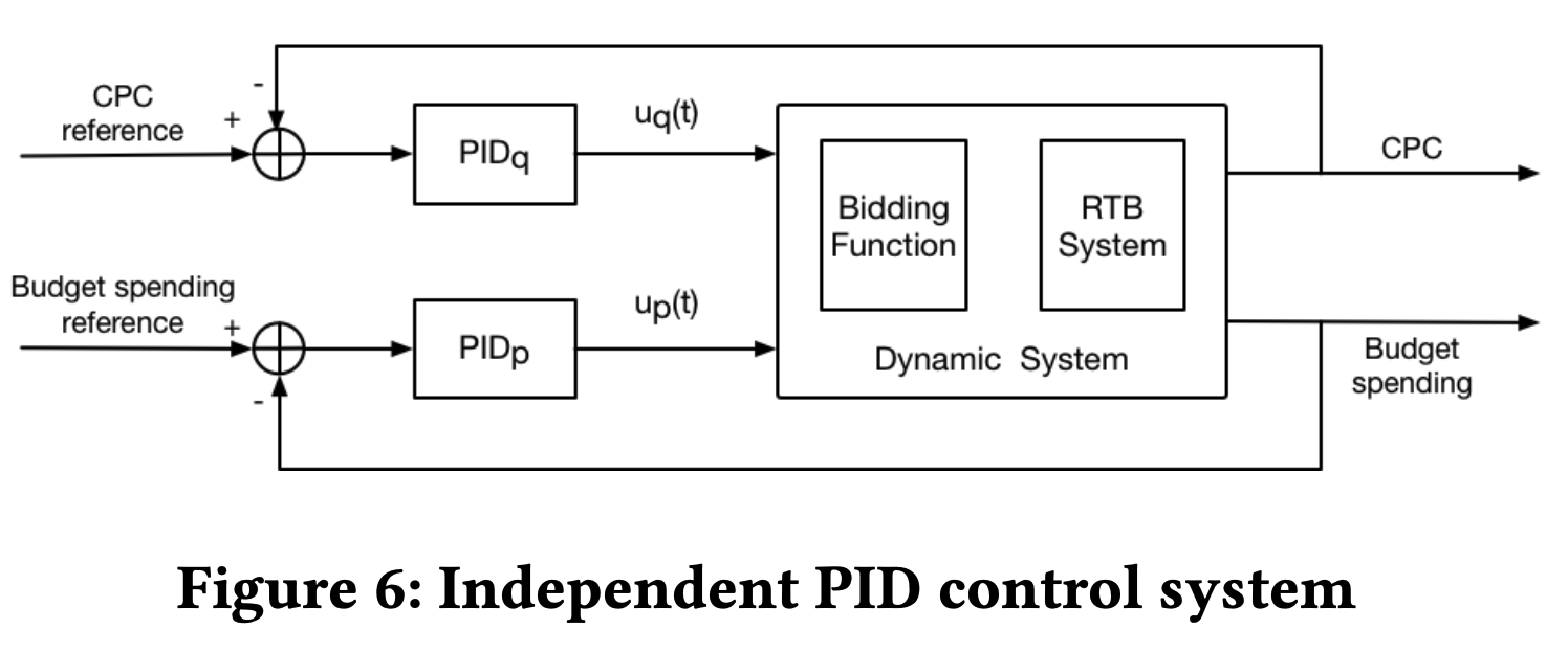 - 如上一节所述,预算支出和CPC可以分别通过 \(p\) 和 \(q\) 明确控制。换句话说, \(p\) 和 \(q\) 可以用于独立控制预算支出和CPC,并将彼此视为外部噪声。因此,我们可以将多变量反馈控制问题分解为两个单变量反馈控制问题。通过这样做,PID控制器可以轻松部署,论文提出了图6中的独立PID设计,其中论文稍微滥用下标 \(p\) 和 \(q\) 以区分两个控制器