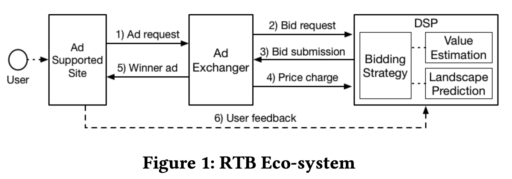 - 在在线展示广告中,广告主为展示广告的机会支付一定费用。实时竞价(RTB)是展示广告中最流行的范式。RTB允许广告主在展示级别对广告机会进行竞价 ,出价最高的广告主赢得展示其广告的机会(每个广告机会的竞价价格可以跟随其效用和成本而改变,这使得广告主能够利用DSP提供的扩展信息和算法)