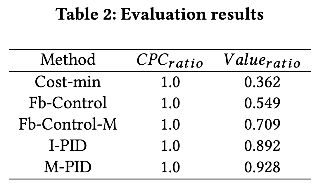 $$ c\_bid_i = b_0 \tag{24} $$ - Fb-Control-M :Fb-Control没有考虑点击的价值(即CVR),这对提高广告性能很重要。因此,论文修改了他们的竞价策略以更好地适应论文的场景,如公式(23)所示,其中 \(b_0\) 通过PID控制器根据论文的成本参考值进行调整,而 \(c\_bid_i\) 的上限通过独立的PID控制器根据CPC的反馈进行控制。上限由给定的CPC初始化,将在每次竞价时截断 \(c\_bid_i\)
