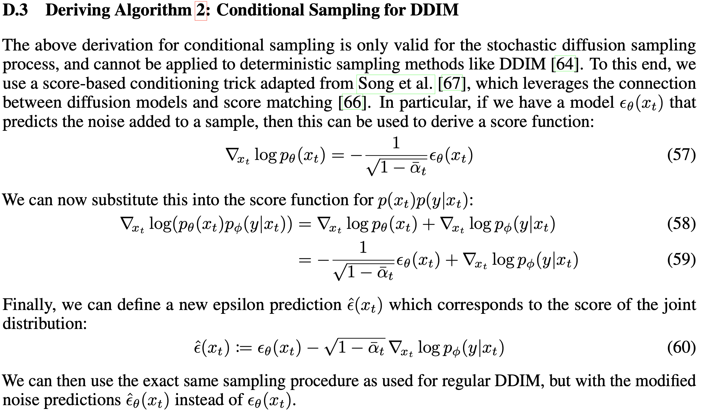 $$\bar{\boldsymbol{\epsilon}}_\theta(\mathbf{x}_t, t) = \boldsymbol{\epsilon}_\theta(x_t, t) - \sqrt{1 - \bar{\alpha}_t} \nabla_{\mathbf{x}_t} \log f_\phi(y \vert \mathbf{x}_t)$$
