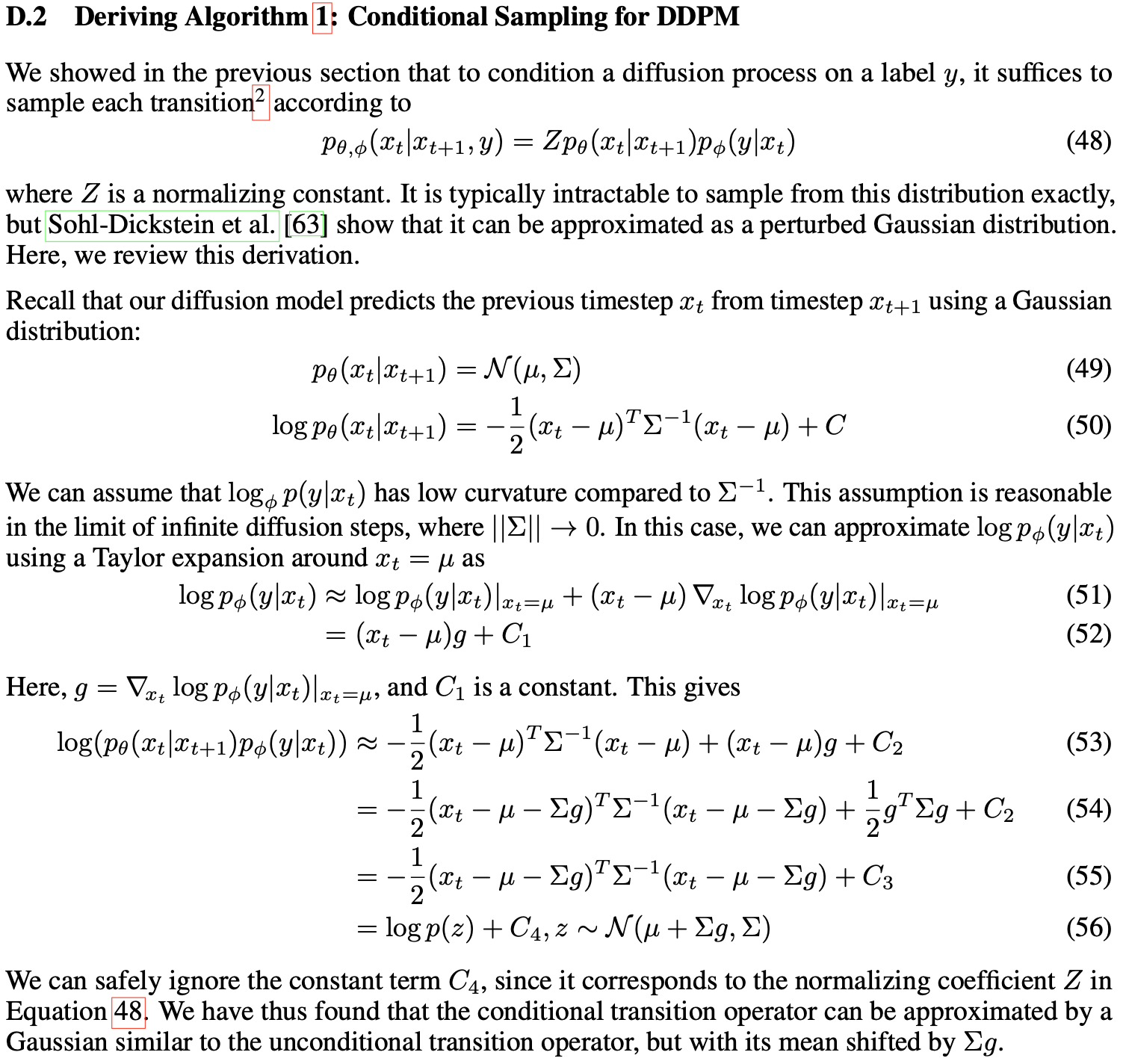 • 在推导过程中,在原始分布 \(p(x_{t-1}|x_t)\) 增加条件 \(y\),则原始分布变成 \(p(x_{t-1}|x_t,y)\)