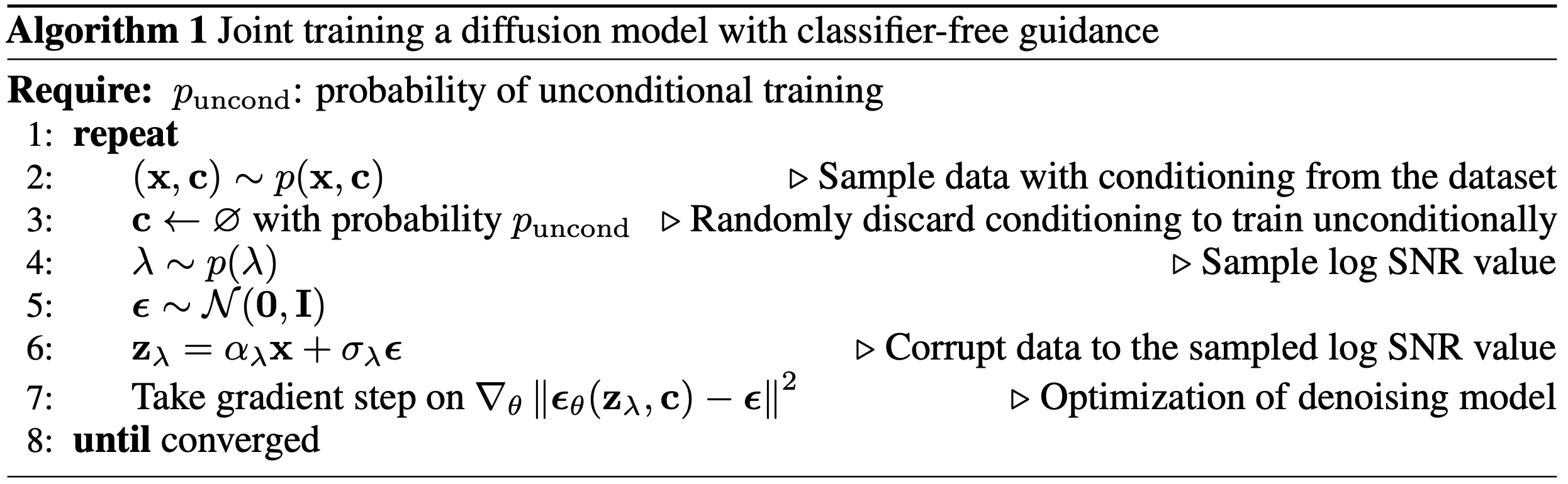 • 总结一下,Classifier-free Guidance方法的训练流程和采样流程如下: