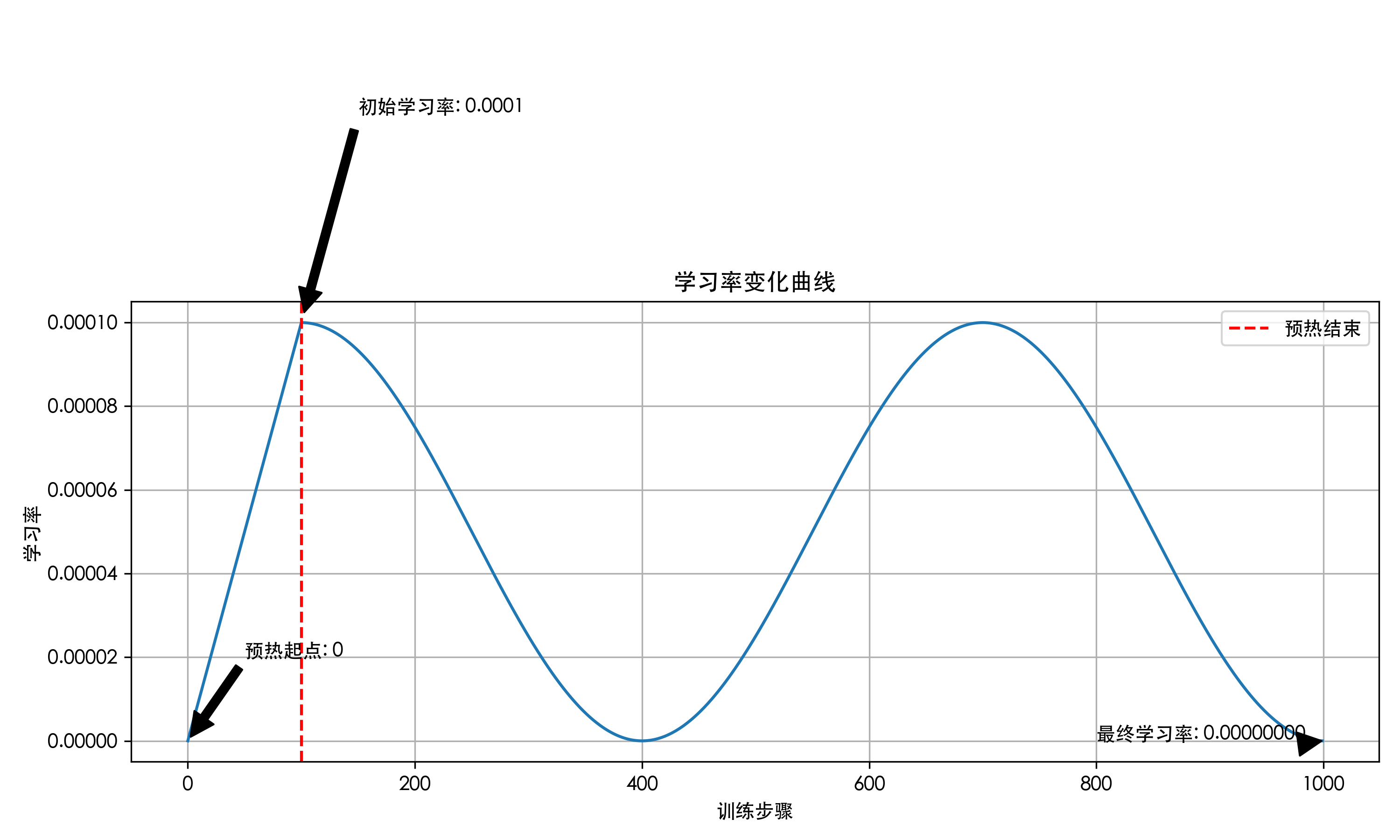 plt.annotate(f'最终学习率: {learning_rates[-1]:.8f}', xy=(num_training_steps-1, learning_rates[-1]),