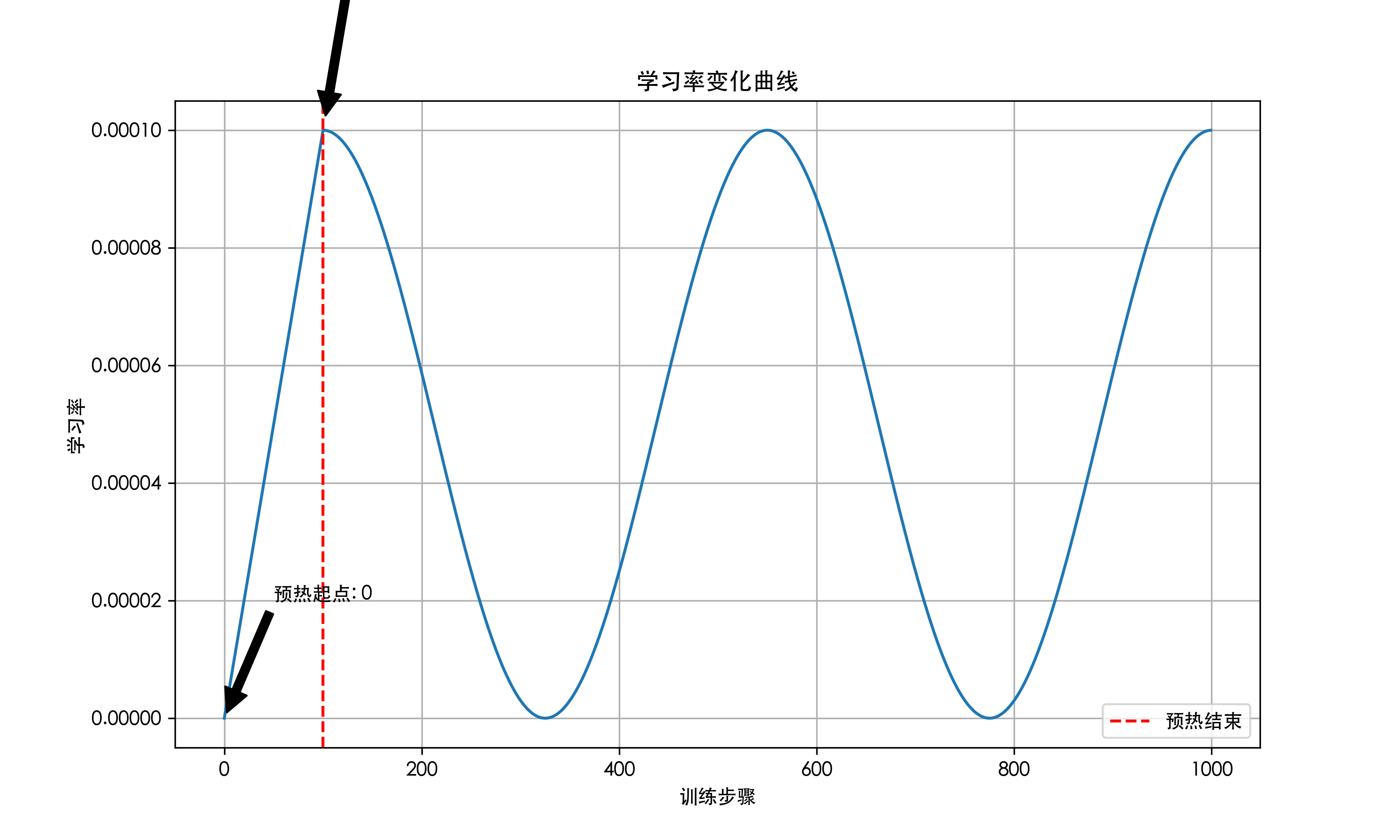 print(f"Step {step}: LR = {optimizer.param_groups[0]['lr']:.6f}, Loss = {loss.item():.4f}")预热阶段(前500步):学习率从