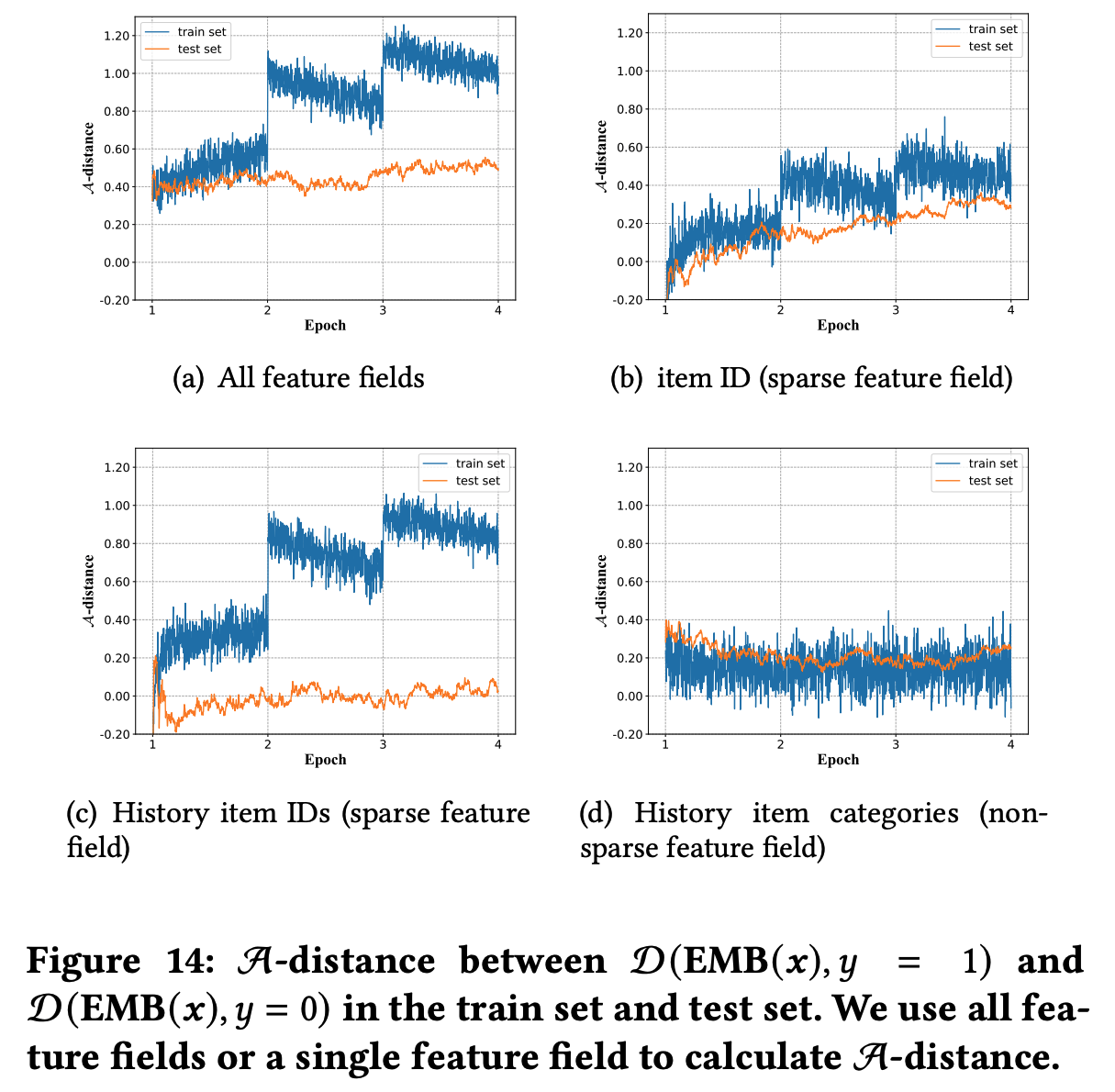 在训练过程中,Embedding层学到了训练集的内容,训练集的分布在训练过程中会发生变化,使得训练集正负样本的 Embedding 距离越来越大,MLP模型要学习的东西越来越容易学习。但测试集正负样本的 Embedding 距离则始终差不多,所以MLP在一个 epoch 后继续训练才很容易进入过拟合