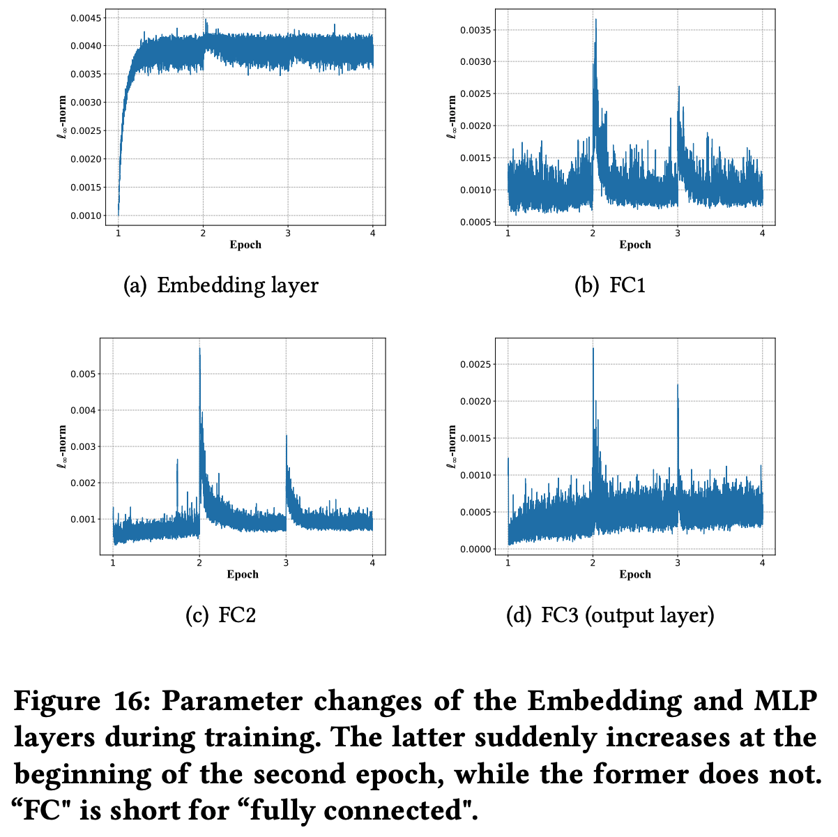 * 回答:文章没有给出详细解释,但个人理解为稀疏和收敛快不一定是严格矛盾的,可能是 Embedding 层参数更容易学习,但从文章给的实验结果看,一个 epoch 后 Embedding 层参数分布确实几乎收敛了