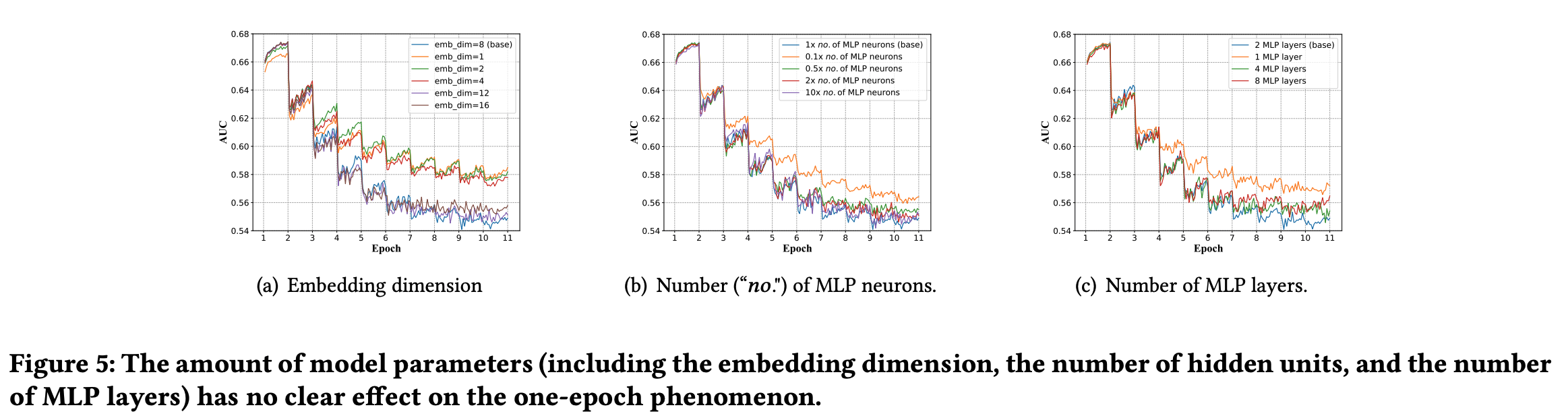 模型优化器与one-epoch现象有紧密关联。在尝试了Adam、RMSprop、SGD等不同优化器后,我们发现Adam和RMSprop在大多数情况下都有更快的收敛速度,也更容易出现one-epoch现象。我们进一步观察到,学习率也与one-epoch现象也有一定关联。在极小的学习率下,one-epoch现象不太明显甚至完全消失,但模型的精度无法保障。 简言之,能使模型快速收敛的优化器算法也更容易导致one-epoch现象Embedding+MLP结构 :这是发生 one-epoch 现象的本质原因(注LR等传统模型就没有 one-epoch 现象)