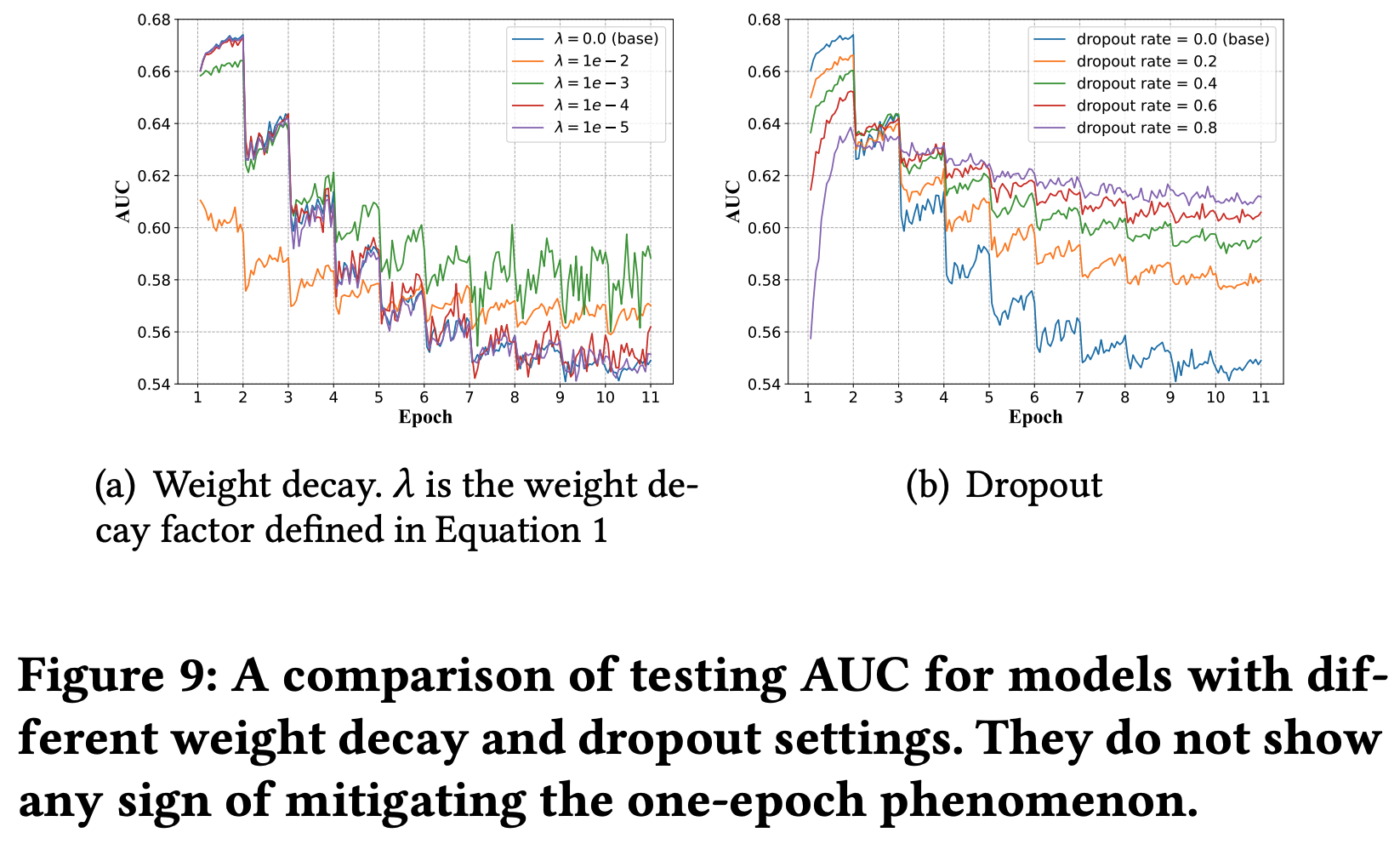 与 one-epoch 现象无关的模型设置:模型参数量、激活函数、batch-size、模型权重衰减(正则化项)、dropout