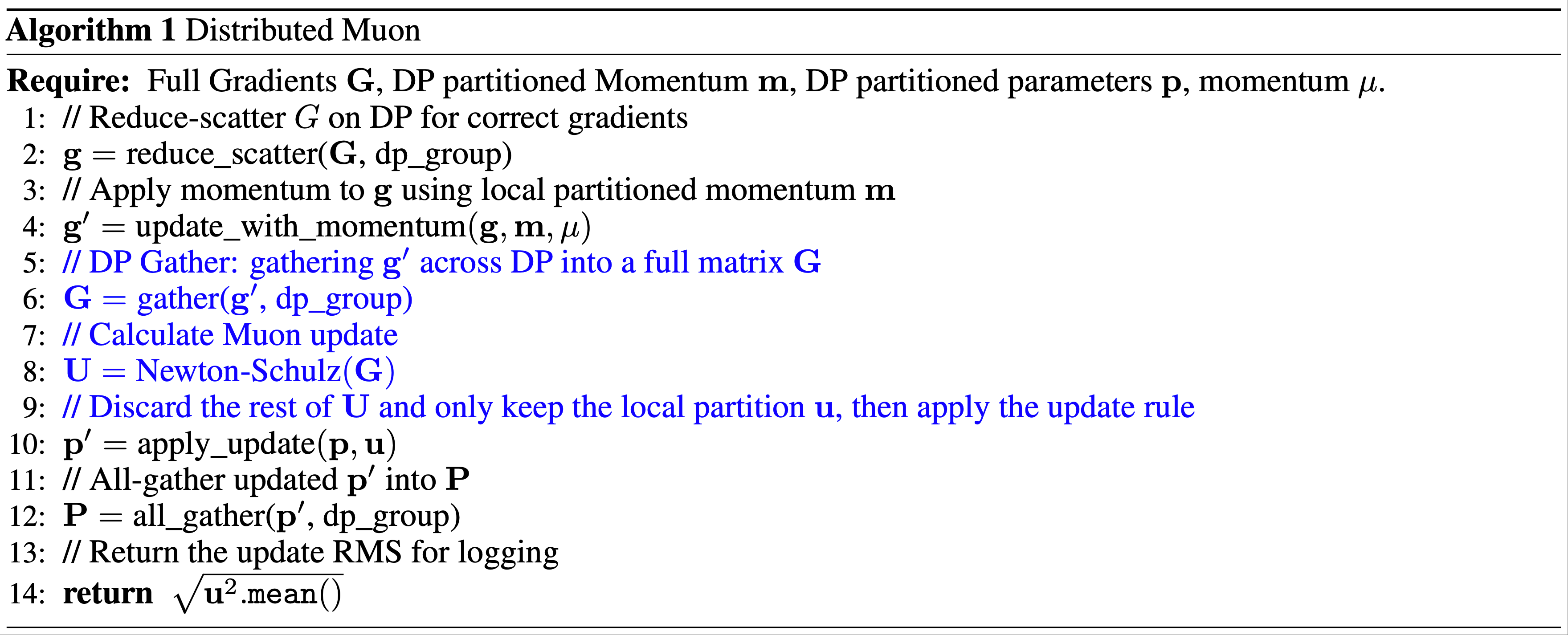 - 论文开发了基于 ZeRO-1(2020)风格的分布式 Muon 版本,实现了最优内存效率和降低的通信开销,同时保留了算法的数学特性