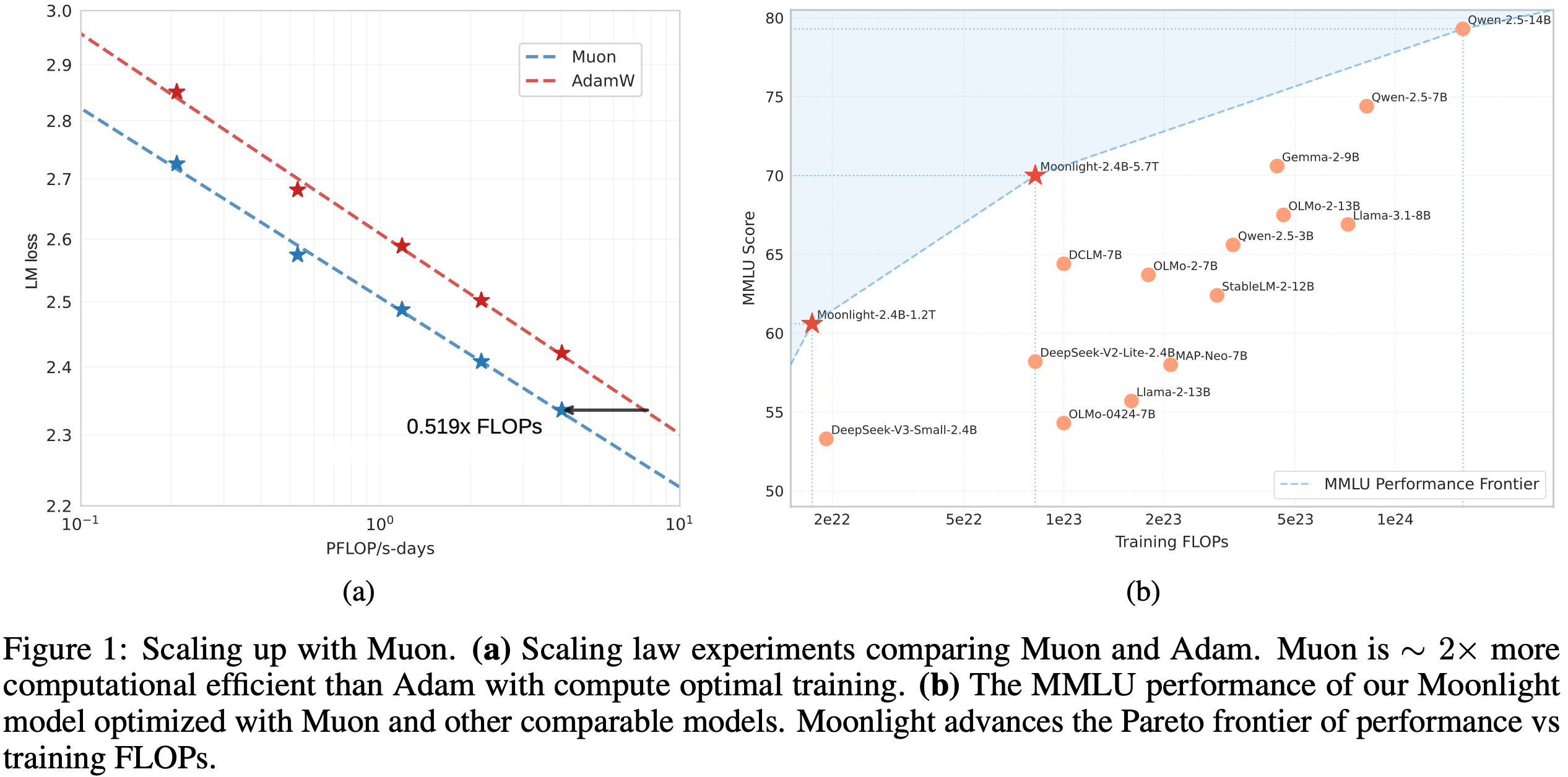 - 根据扩展定律结果,Muon 在仅需约 52% 的训练 FLOPs 时,即可达到与 AdamW 训练模型相当的性能
