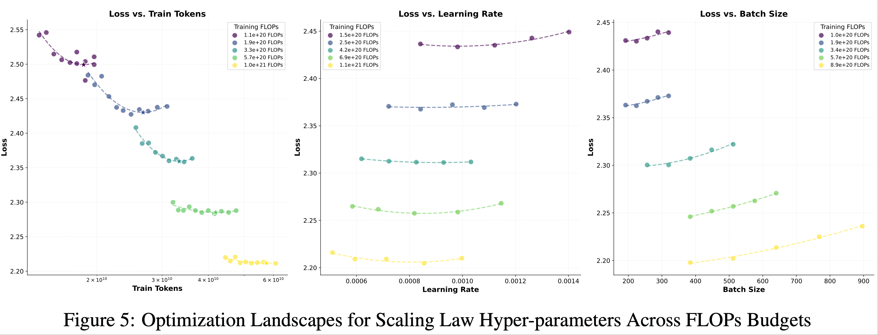 - 图 5 进一步展示了优化过程,描绘了不同 FLOPs 预算下损失随训练 token、学习率和批大小的变化情况