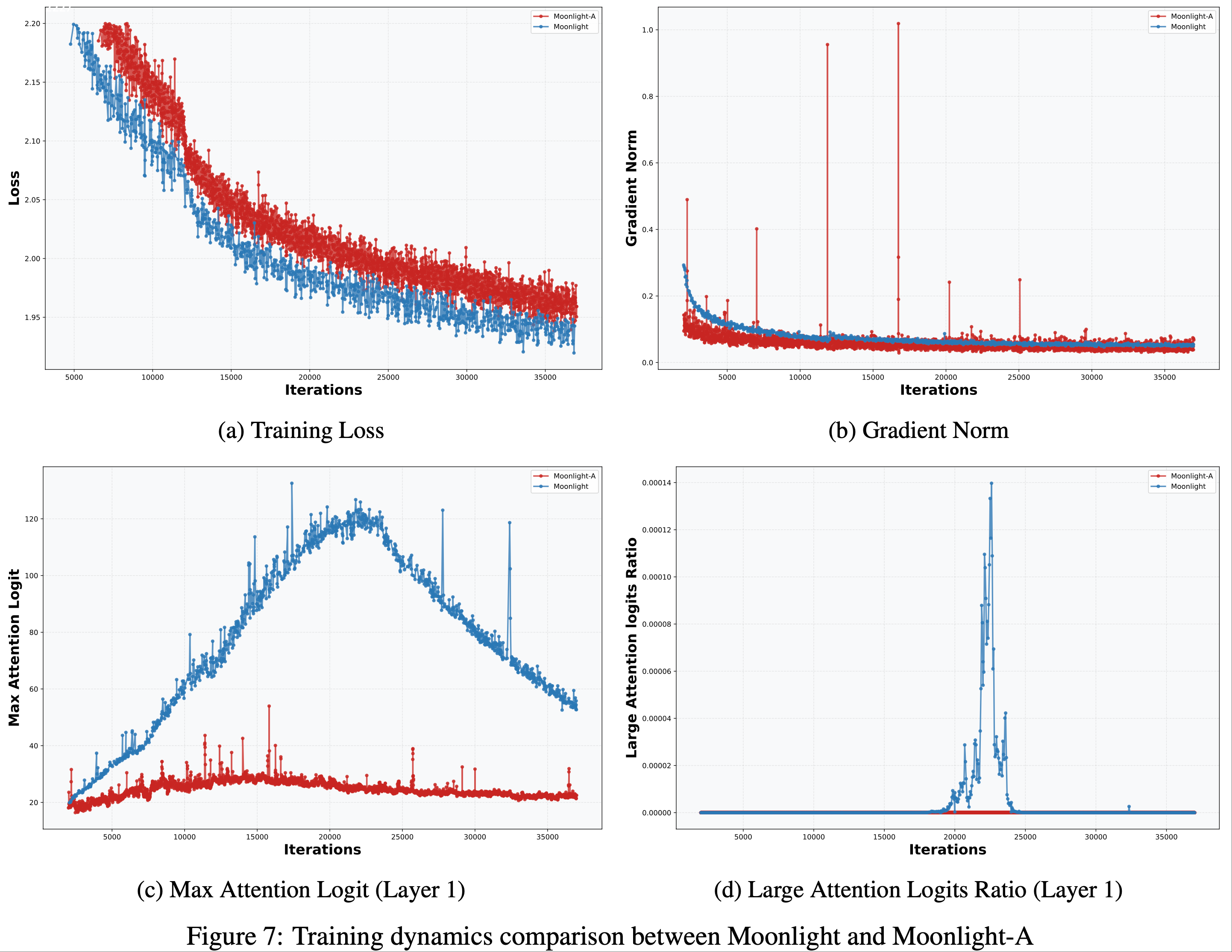 - 损失和梯度范数曲线如图 7 所示(Moonlight 为蓝色,AdamW 训练的 Moonlight-A 为红色)