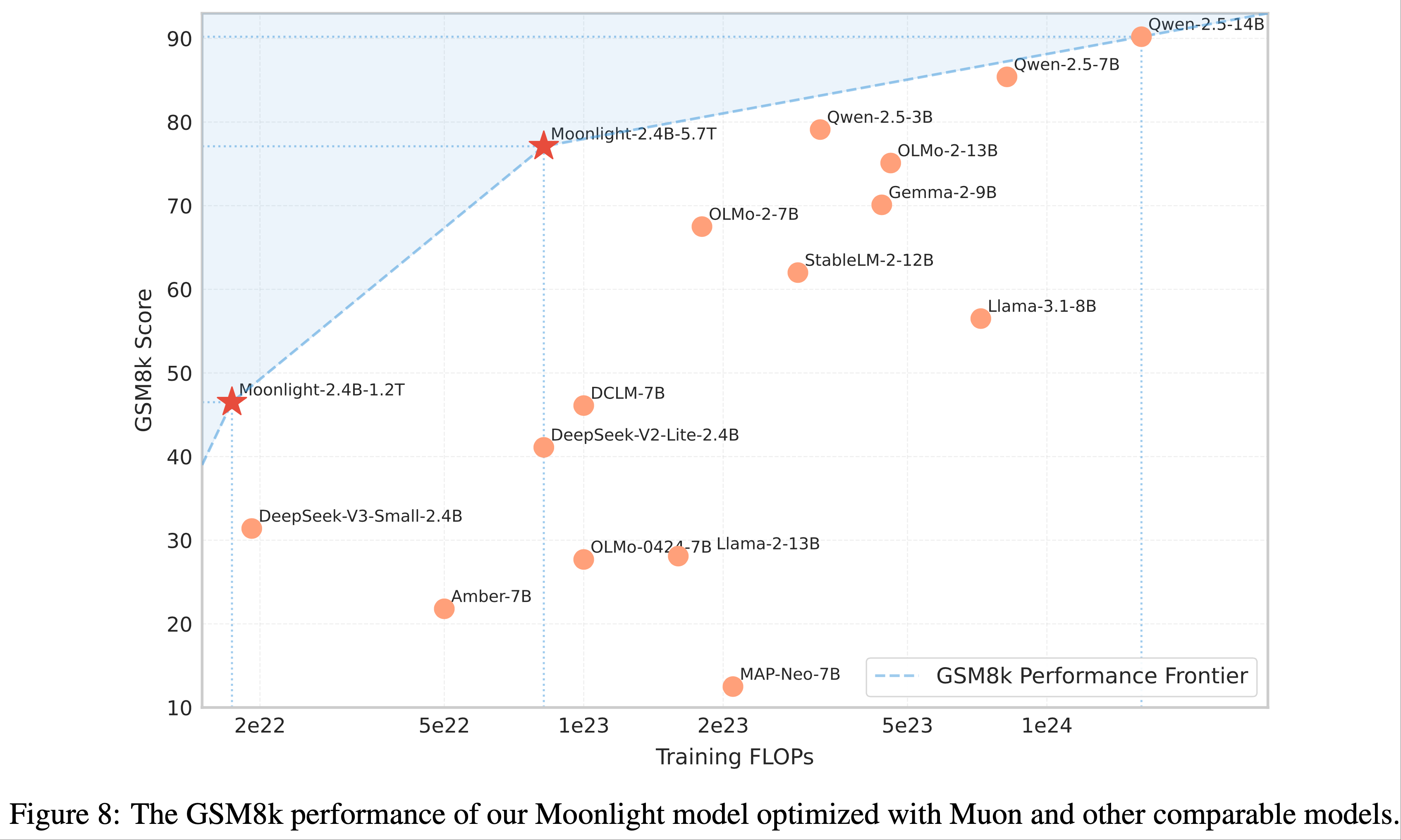- 图 8 展示了 Moonlight 与同类模型在 GSM8k 性能基准上的对比