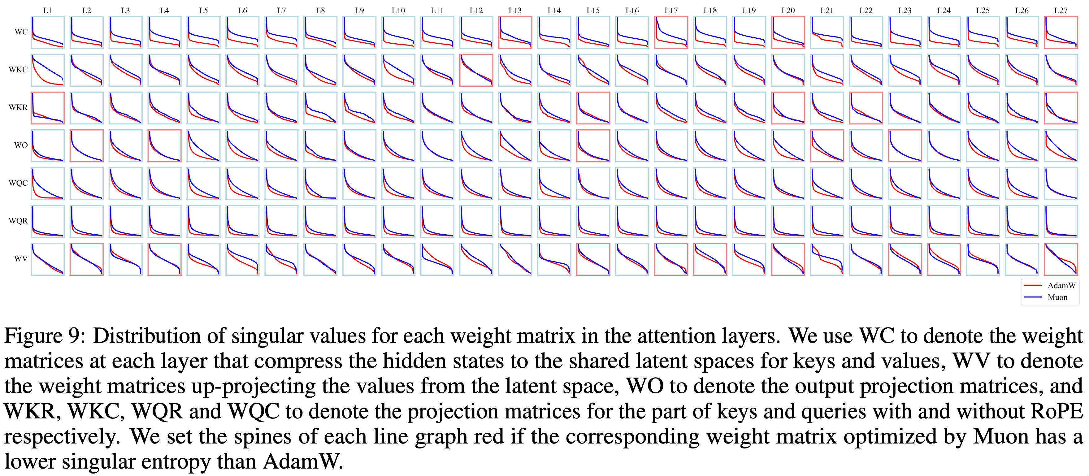 - 如图 9 和图 10 所示,论文发现对于大多数权重矩阵,Muon 优化的奇异值分布比 AdamW 更平坦,进一步验证了 Muon 能提供更多样化的更新谱的假设