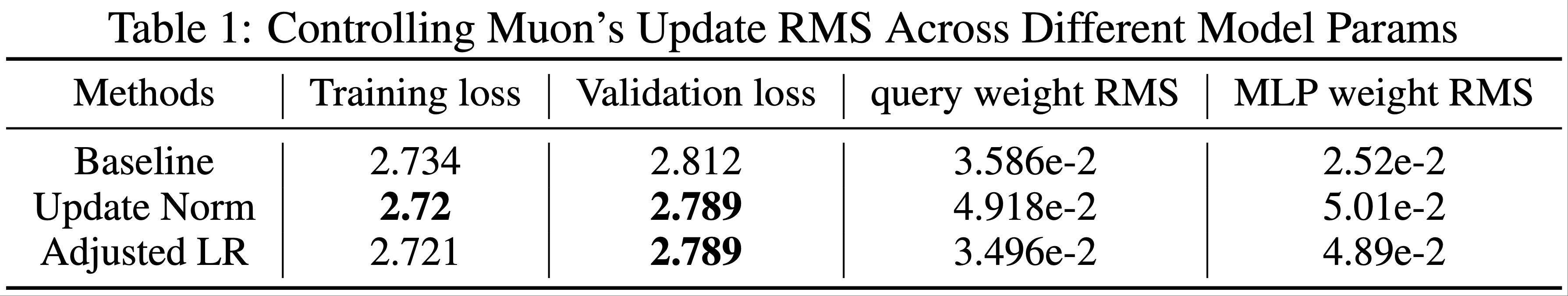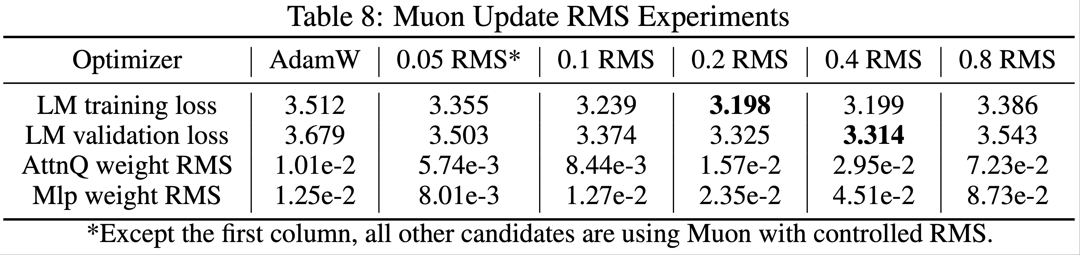- 论文将 Muon 的更新均方根设置为 \([0.05, 0.1, 0.2, 0.4, 0.8]\),并以 AdamW 为基线