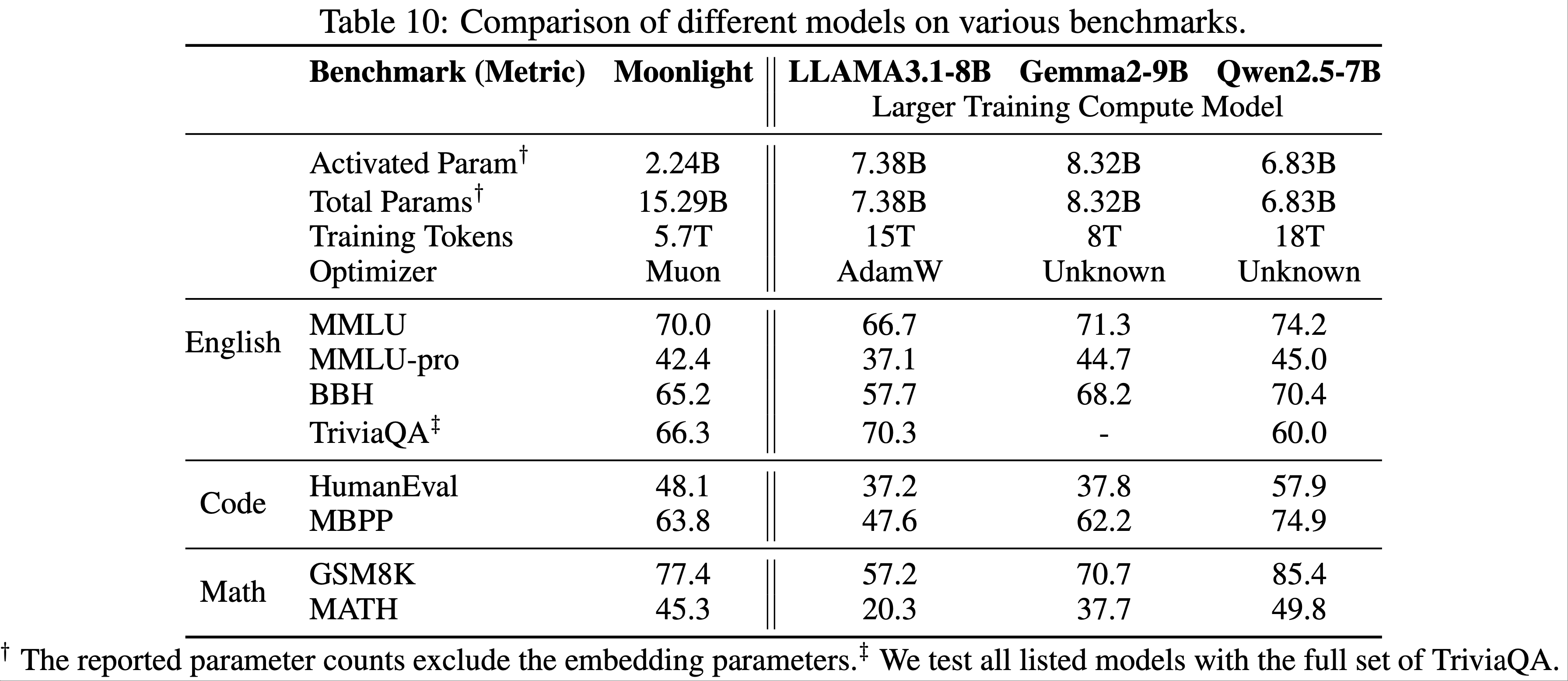 - 表 10 对比了论文的 Moonlight 模型(使用 Muon 优化)与公开可用的更高计算资源训练的模型,包括 LLama3.1-8B(2024)、Gemma-9B(Gemma 2024)和 Qwen2.5-7B(2024)