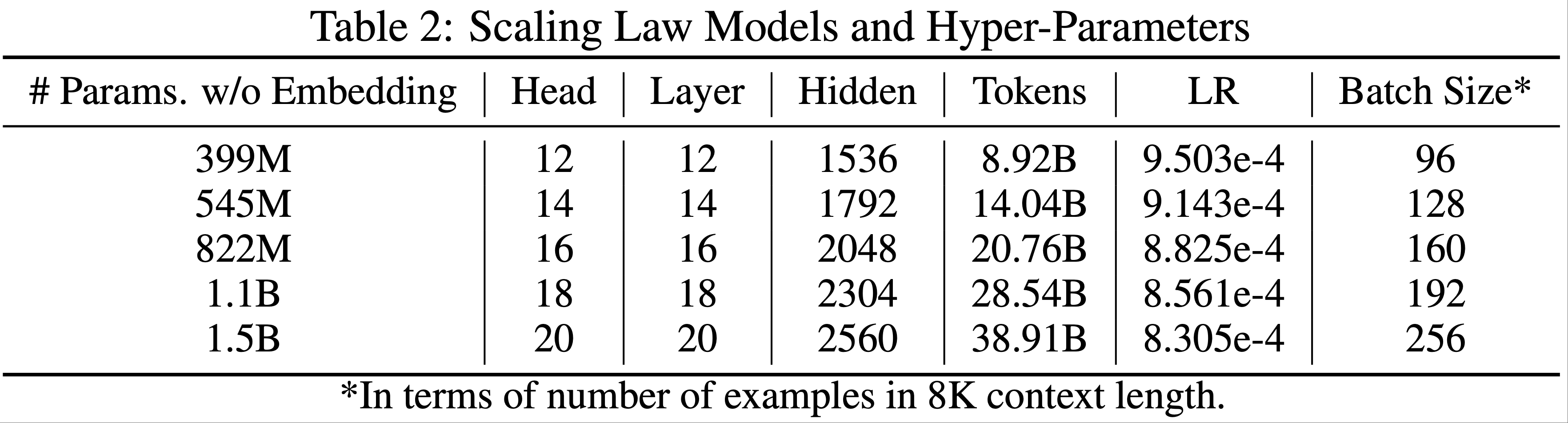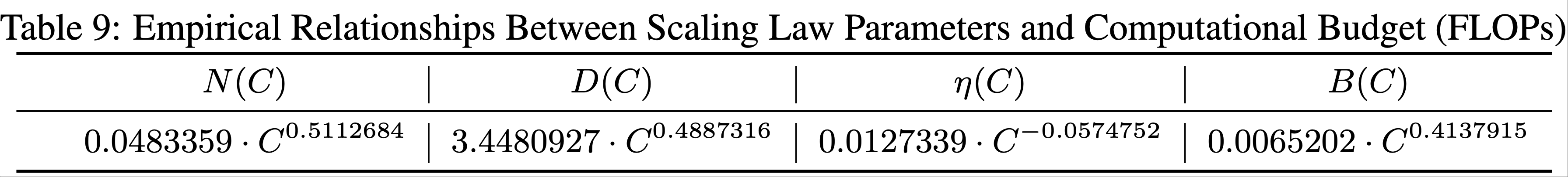 - 这包括在计算预算(FLOPs,\( C \))约束下,确定最优模型大小(\( N \))、训练 token 数量(\( D \))、学习率(\( \eta \))和批大小(\( B \))(2022;2020)