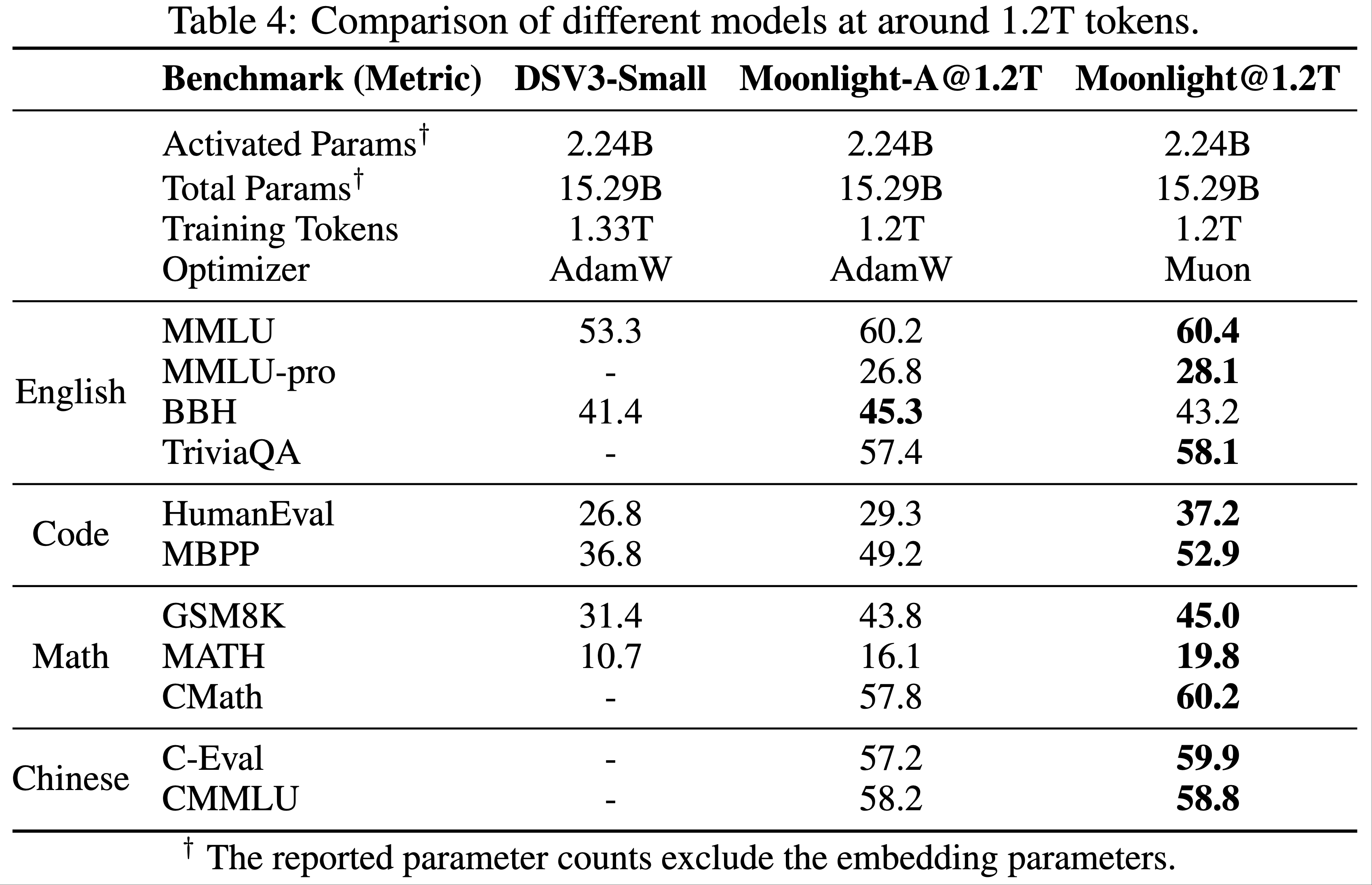 - 结果如表 6 所示,Moonlight@1.2T 的表现优于 Moonlight-A@1.2T