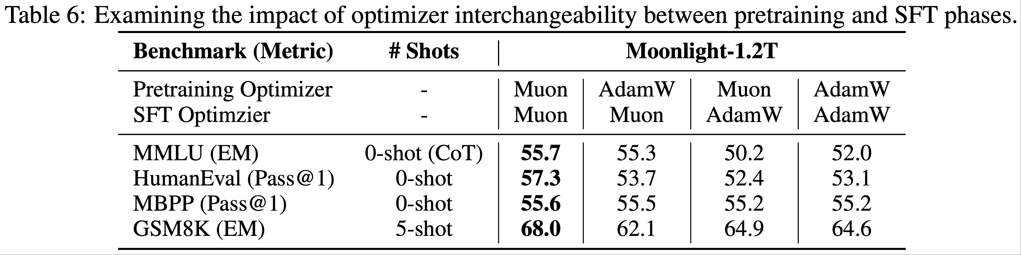 - 这些结果表明,为了获得最佳性能,在预训练阶段应用 Muon 比在监督微调阶段更有效