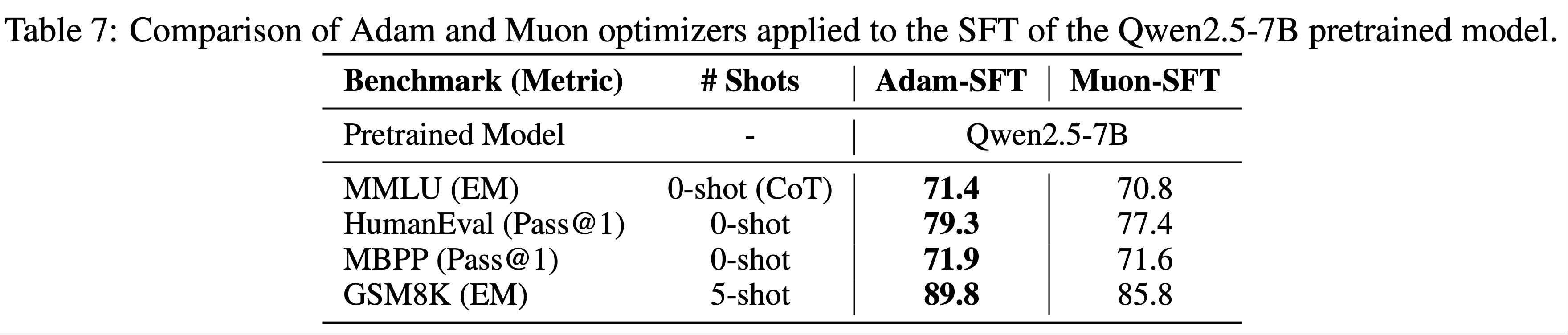 - 结果如表 7 所示: Muon 微调模型的性能与 Adam 微调模型相当