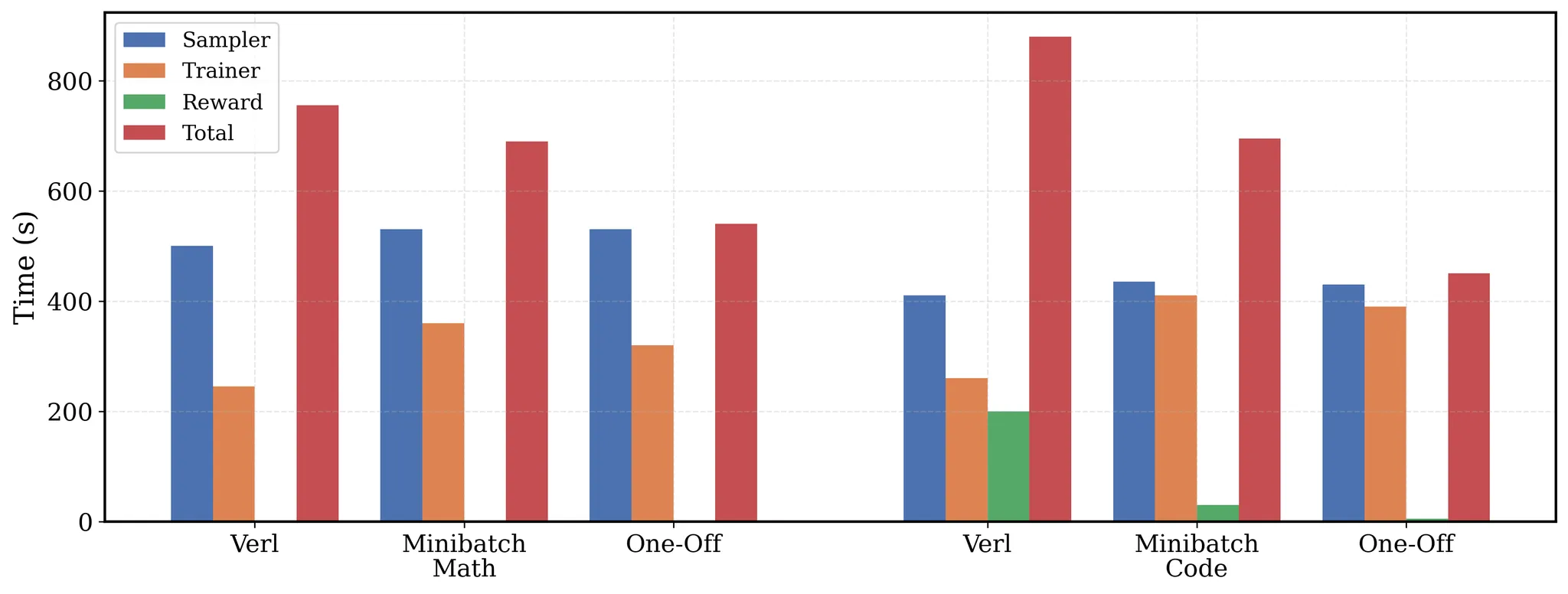 - 为保证公平性,所有基准方案均通过 Python 线程池并行计算奖励;而 verl 官方版本对每个样本的奖励计算为串行执行,这对于编程任务而言耗时过长,不具备实际可行性