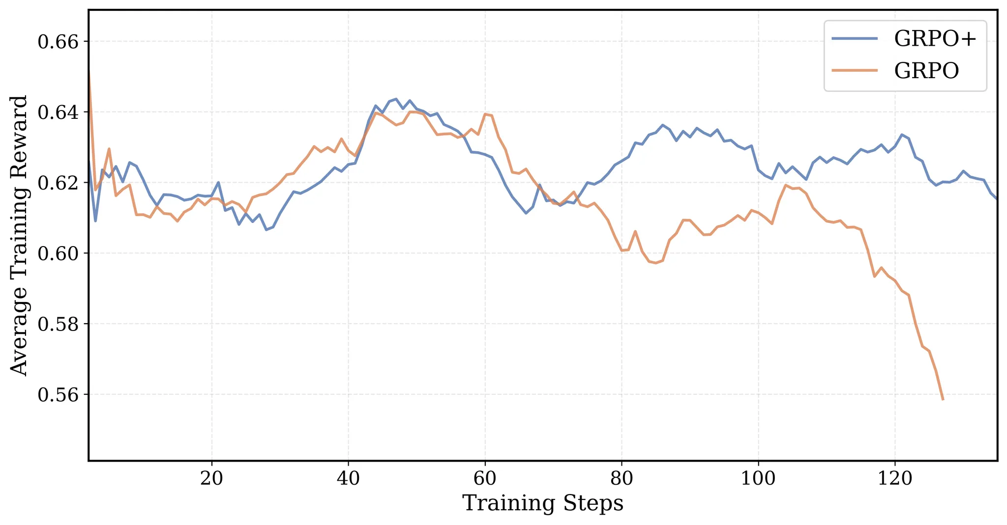 - 图 2: GRPO+ 和 GRPO 在 16K 运行中的平均训练奖励。GRPO 的奖励曲线最终崩溃。由于 Clip High,GRPO+ 的曲线保持稳定