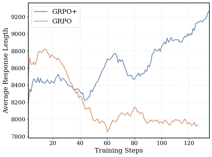 - 图 3: 由于长序列过滤,GRPO+ 的响应长度随时间稳步增长
