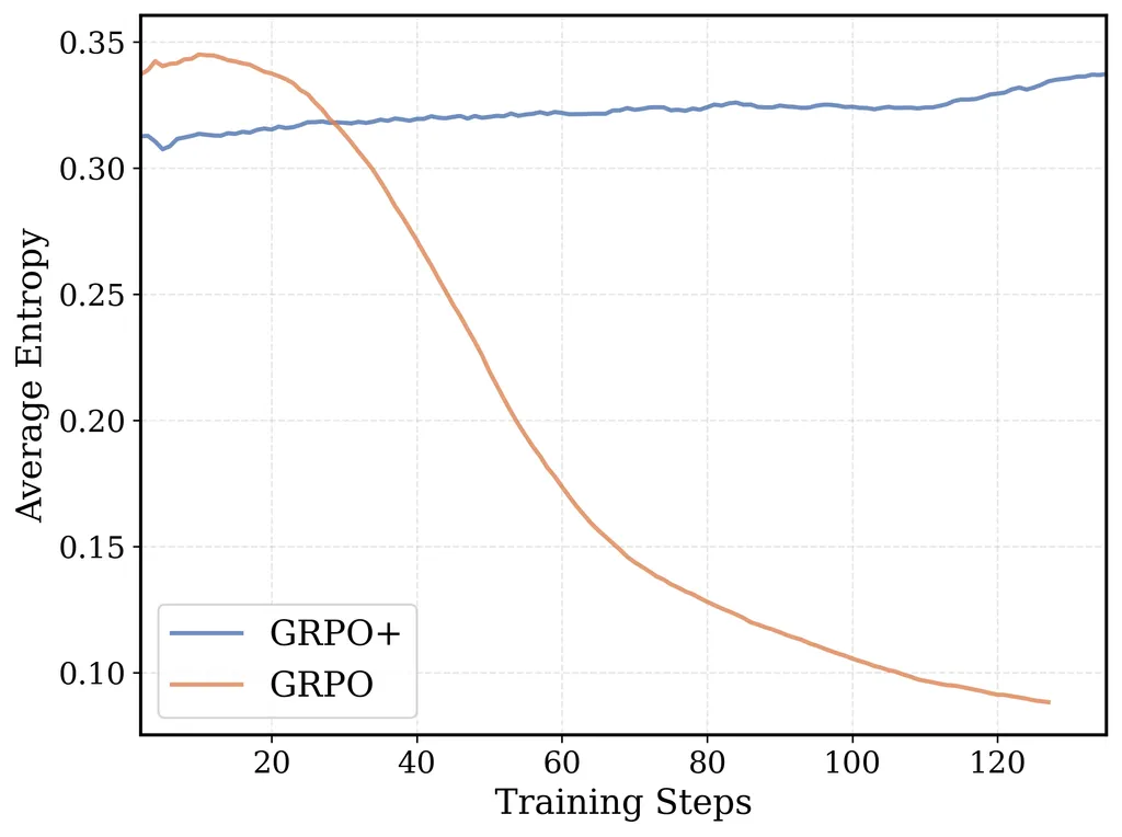 - 图 4: Clip High 和无熵损失确保了 GRPO+ 的 token 级熵不会崩溃,并鼓励足够的探索