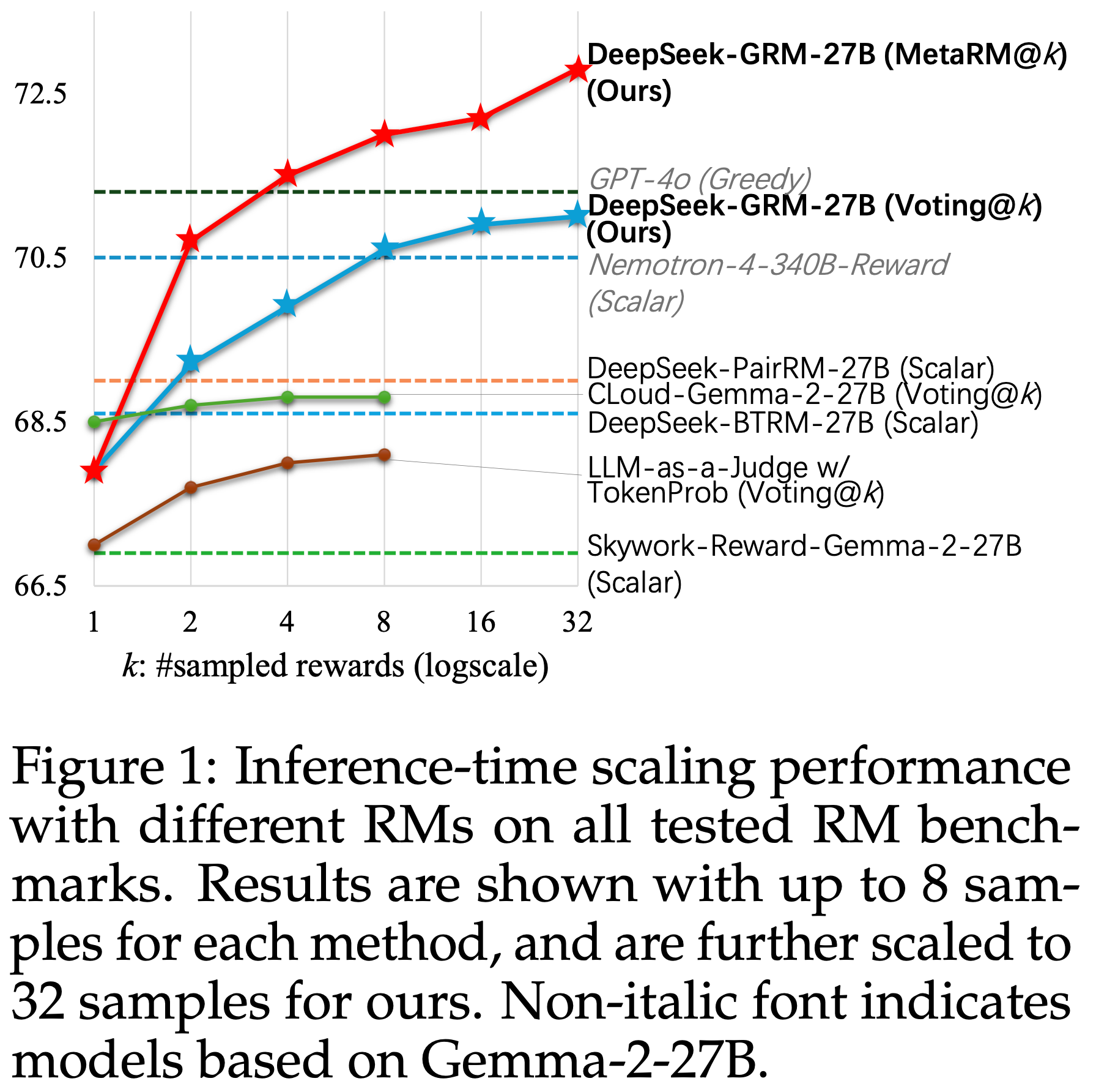 - 通过更大规模的采样,DeepSeek-GRM 可以基于更多样化的 Principle 进行更准确的判断,并以更细的粒度输出奖励 ,这解决了挑战(3)和(4)